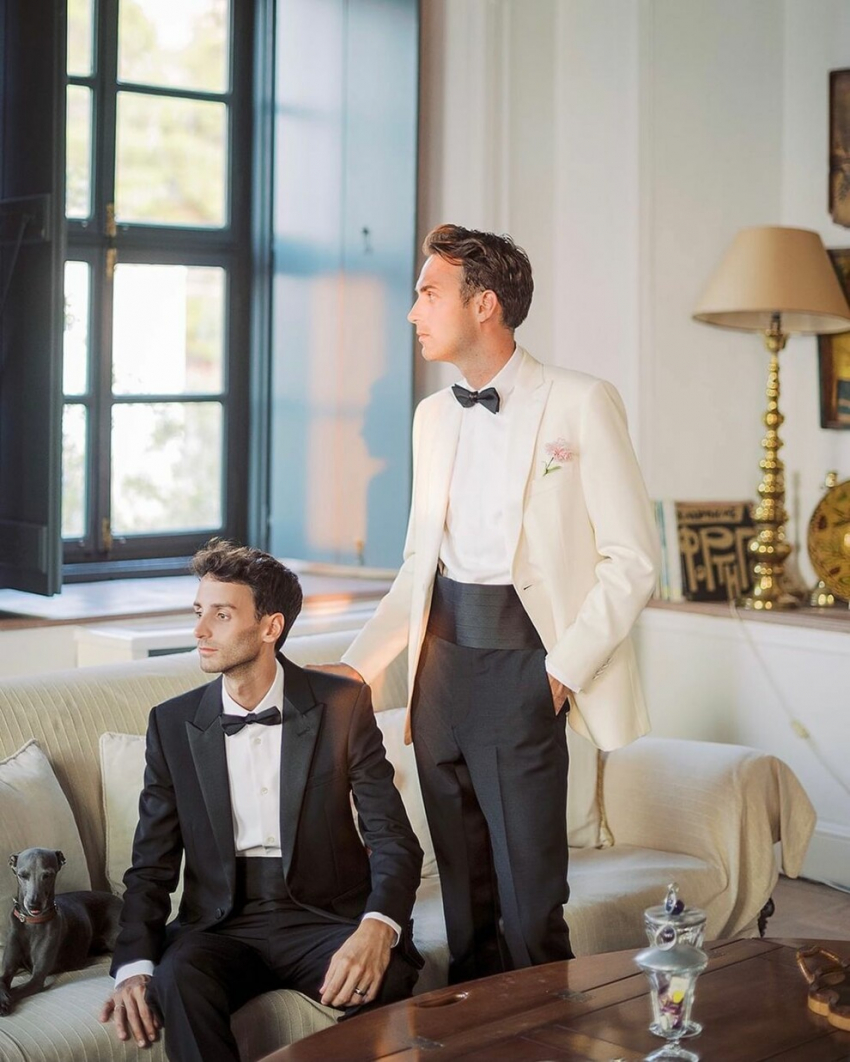 Себастьен Мейер и Арно ВайнтВозлюбленные выбрали контрастные по цвету и настроению костюмы – Арно Вайнт шел к алтарю в брюках светло-песочного оттенка и темно-синем жакете с крупной металлической фурнитурой, а Себастьен Мейер отдал предпочтение чистому белому цвету. Оба отказались от галстуков. Затем дизайнеры предстали перед гостями в классических смокингах с бабочками.