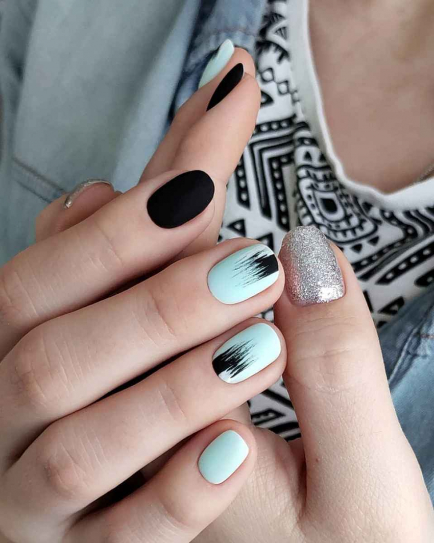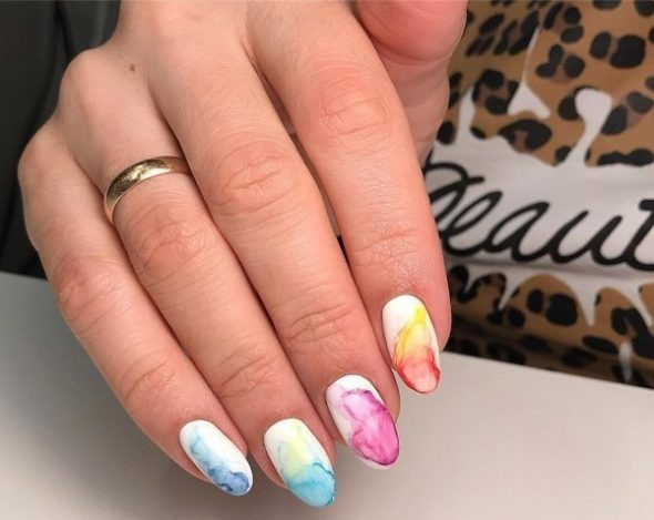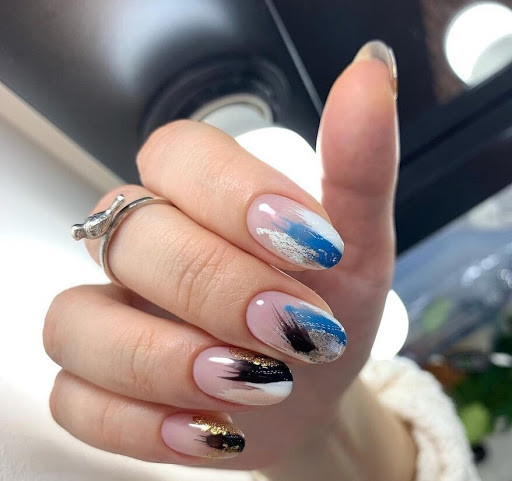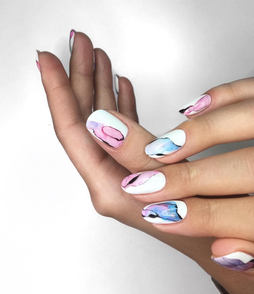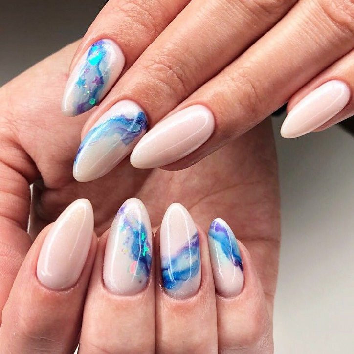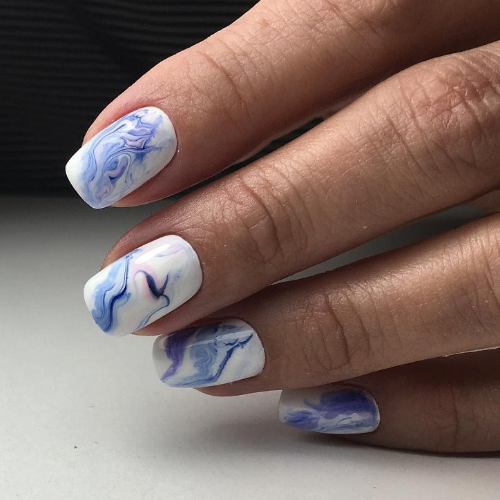 Актуальным на протяжении нескольких сезонов остается узор разводов краски. Выглядит это необычно, подходит для разных случаев. На отдыхе ногти синего цвета с голубыми и белыми разводами будут выглядеть, как морская пена. Также разнообразить узор можно, добавив лак золотого или серебряного цвета.