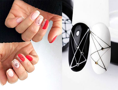 Необязательно покрывать таким рисунком все ногти, можно выбрать один или два пальца. Необычно смотрится вариант с кривой широкой линией посередине ногтевой пластины. Поверх узора можно добавить блестки или камни, чтобы разнообразить маникюр.