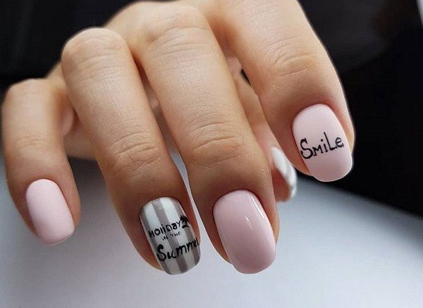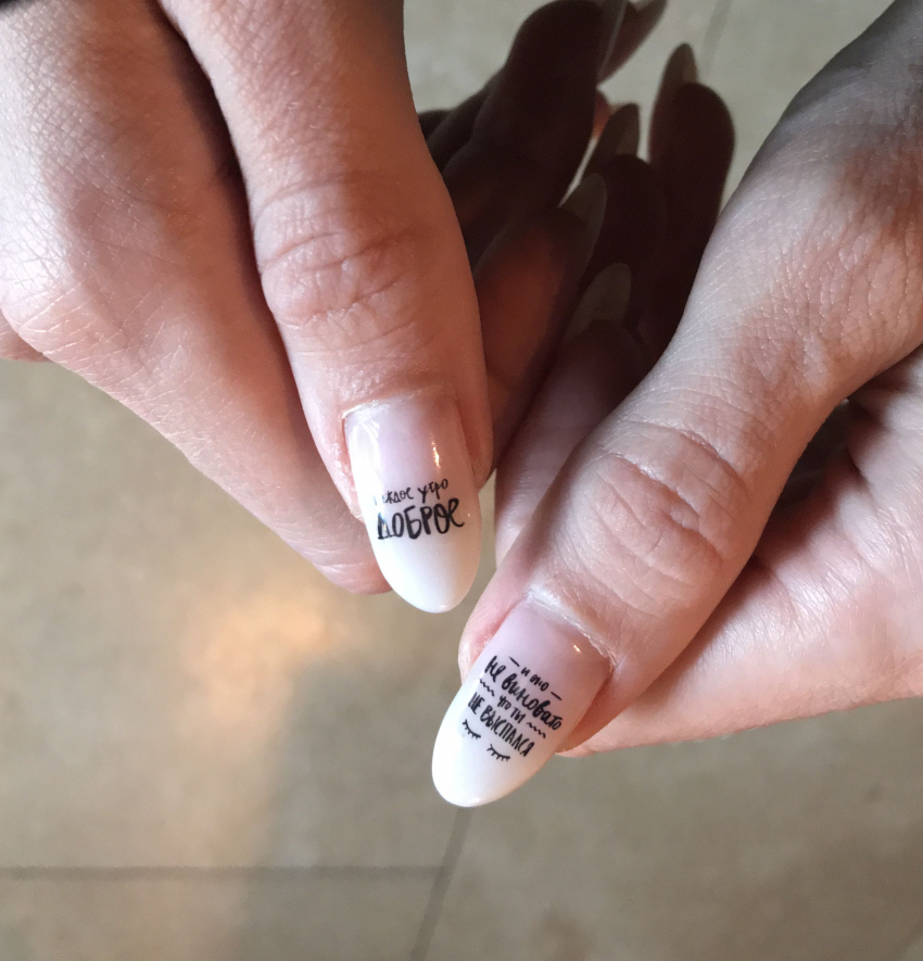 Еще один дизайн, который продолжает оставаться в тренде на протяжении нескольких сезонов, — надписи. Сейчас мастера редко наносят их от руки, в основном для создания рисунка используют специальные наклейки. Их нанесение сокращает время, потраченное на создание дизайна в разы.