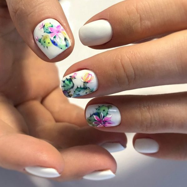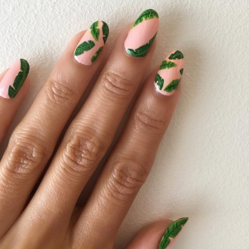 Для рисунка можно выбрать веточки, пальмовые листья и аналогичные мотивы. Главное, чтобы маникюр был уместен. Например, на отдых можно сделать монстеру, весной выигрышно будут смотреться ветки сирени или изящного дерева.