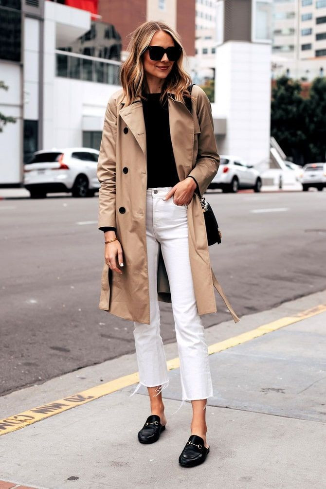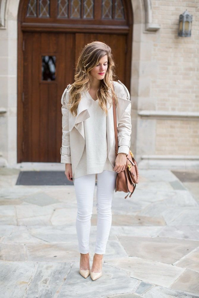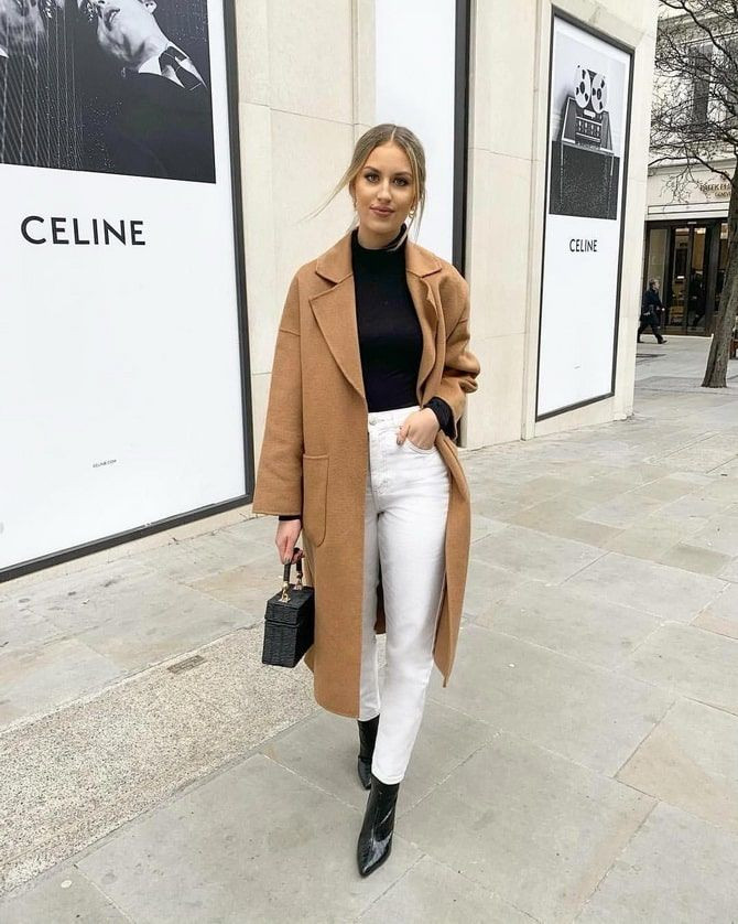 Белый цвет хорошо сочетается с мягкой пастелью осени. Потому, когда будете выбирать цвет пальто под белые джинсы, обратите внимание на бежево-коричневые оттенки. Цвет капучино, карамель, верблюжий, кремовый, коньячный, нюдовый создает налет французского шика. Такая гамма цветов очень подходит блондинкам, а брюнеткам следует выбирать более холодные тона.
