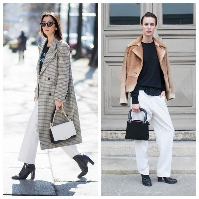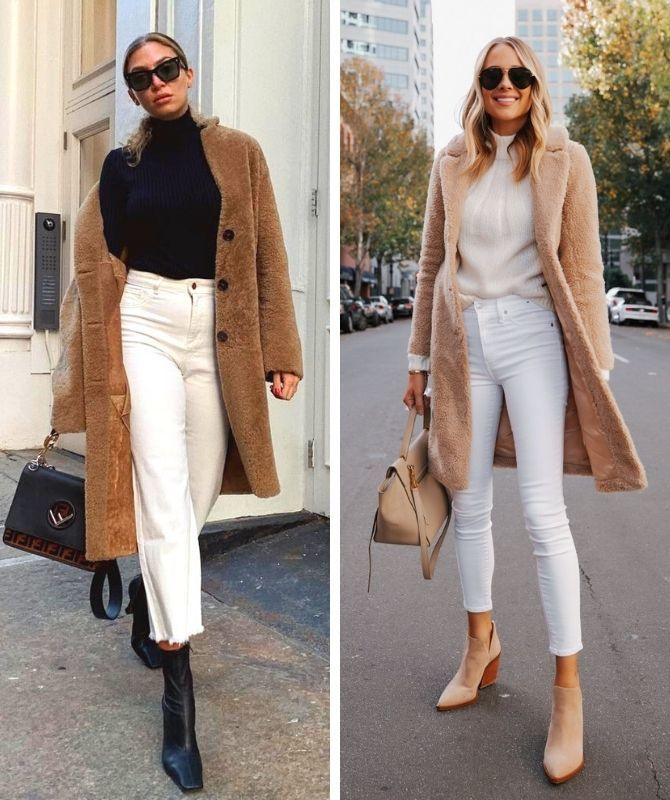 Если в вашем гардеробе живет плюшевое пальто – смело выгуливайте его с белыми укороченными джинсами.