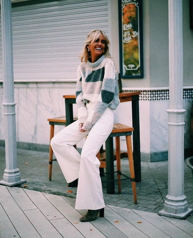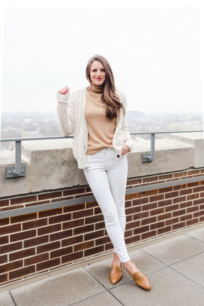 Кардиган + белые джинсы – безупречная кэжуальная комбинация. Если не уверены, с чем сочетать белые джинсы, этот предмет гардероба выручит в любой ситуации. Под низ одевайте водолазку или тонкую кофточку. Используйте этот прием, когда нет времени подбирать наряд. Вязаный кардиган – это ответ на вопрос «Как носить белые джинсы женщинам за 50?» Это незаменимая уютная вещь для дам любого возраста.
