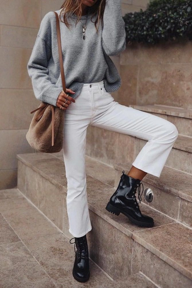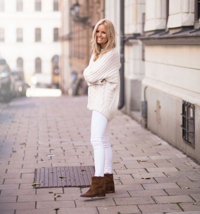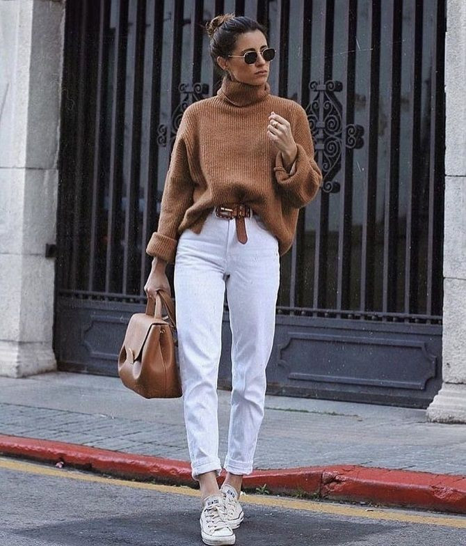 Красивый осенний лук – свитер оверсайз в паре с белыми рваными джинсами. Кстати, в этом сезоне модно носить свитер, полностью заправленный в джинсы или только переднюю полочку. Удачные цвета верха – серый, светло-коричневый и нейтральные. Невозможно представить такой лук без белых кроссовок – самая удобная обувь для начала осени.