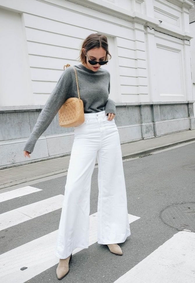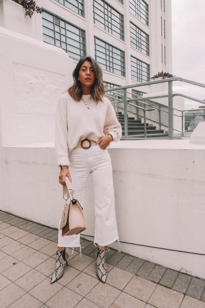 Белые джинсы идеально подходят для создания элегантного повседневного или полуформального образа. Нет особо строгих правил, с чем можно носить белые джинсы для создания расслабленного лука. Можете выбирать между футболкой, рубашкой или водолазкой нейтральных цветов. Интересно выглядят в такой комбинации расклешенные модели джинсов с необработанными краями.