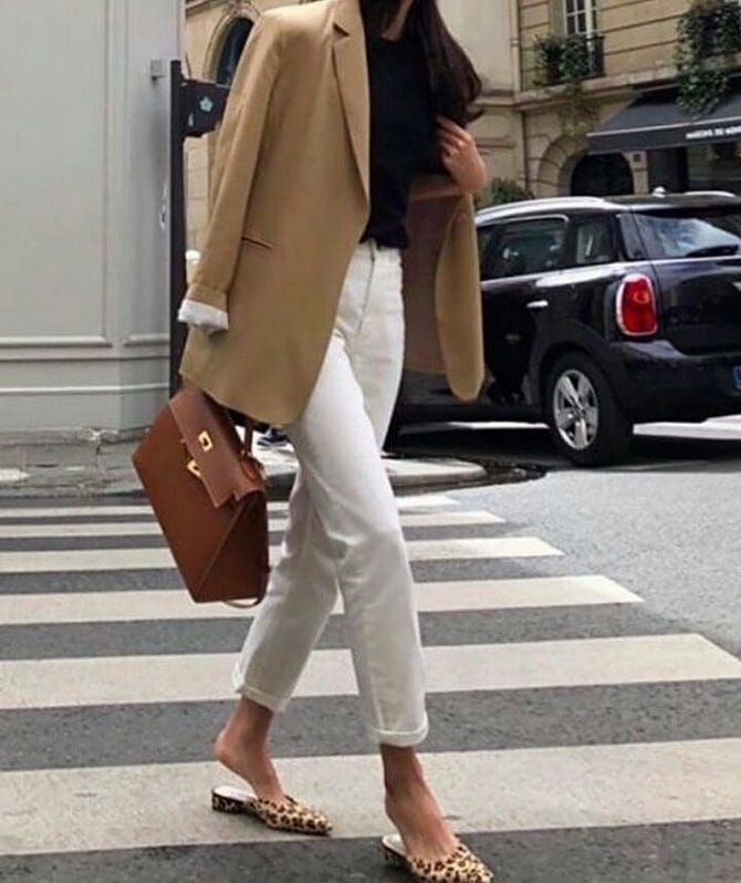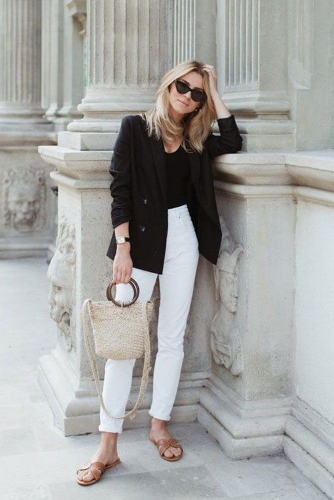 Устали от одного и того же брючного костюма, который носите на работу каждый день? Наденьте вместо него прямые белые джинсы и шикарный блейзер, чтобы образ выглядел модно и вписывался в деловой стиль. Если хотите визуально удлинить ноги, позаботьтесь, чтобы пиджак был темного цвета.