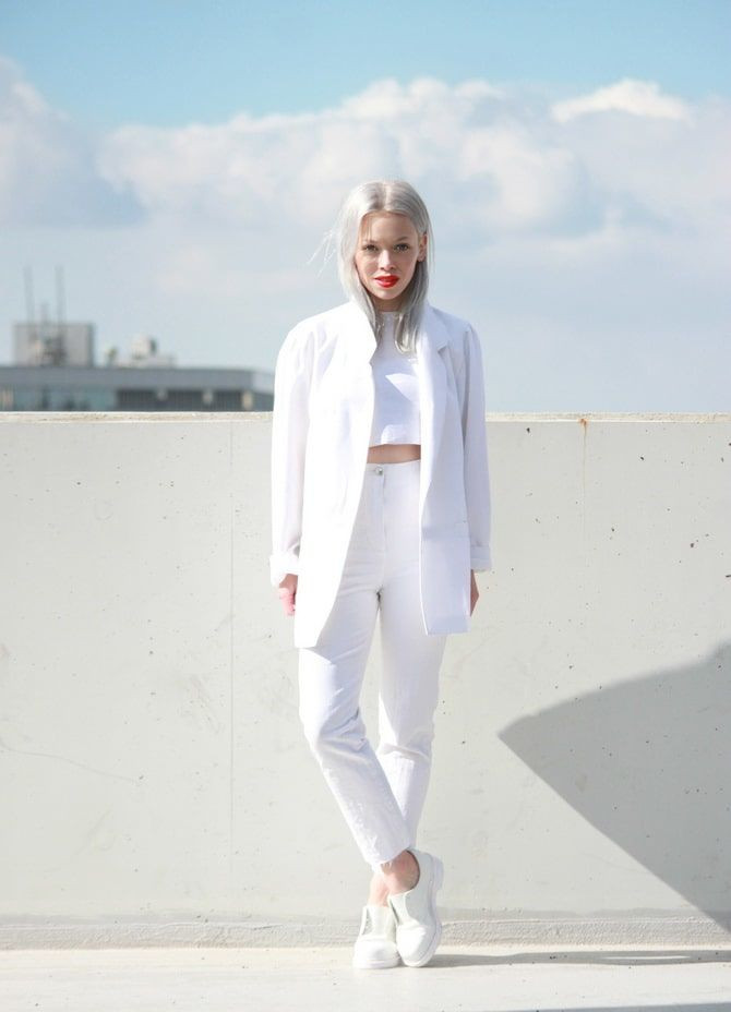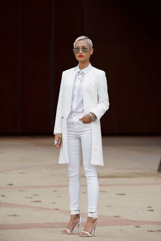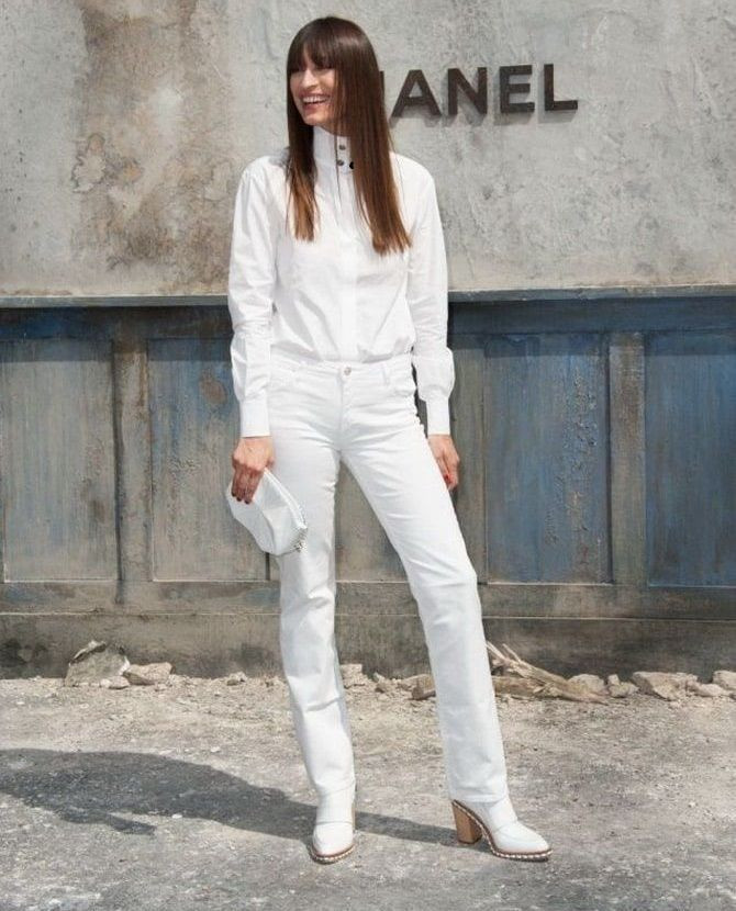 Белое с белым – это образ на миллион. Таким образом создаются красивые, праздничные луки с любым фасоном джинсов из белого денима. Большой плюс ткани джинс в плотности. Во-первых, ваше белье не будет просвечиваться, во-вторых любое пятно и грязь отстирается без проблем. Хотите выглядеть стильно и роскошно — выбирайте total white look.