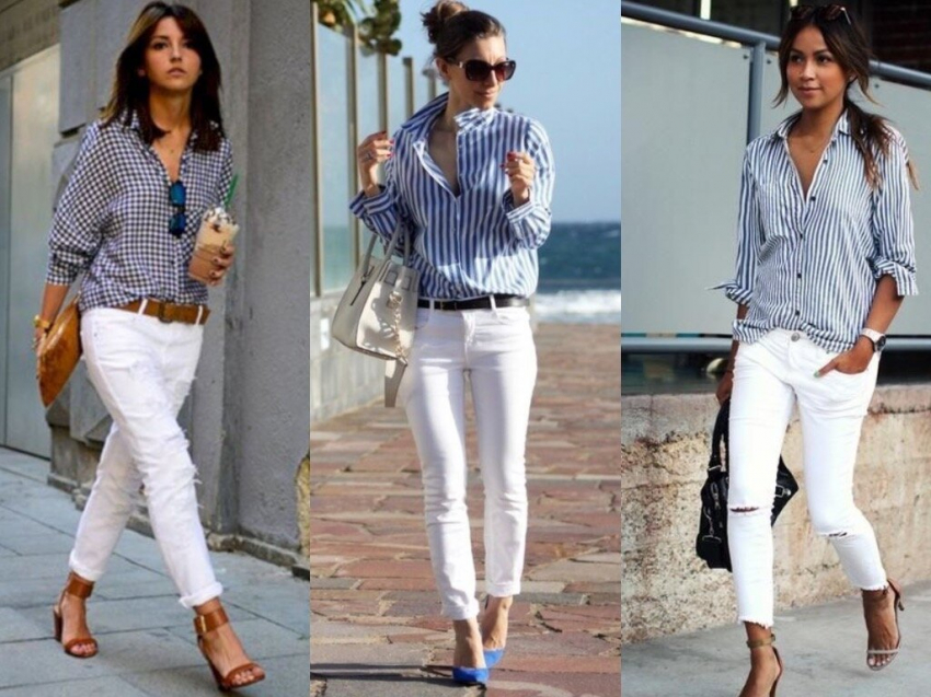 Это один из самых популярных вариантов образов. Джинсы сами по себе всегда отлично смотрятся практически с любой рубашкой. А конкретно белый вариант идеально сочетается с классическими светлыми оттенками рубашек, с рубашками в клетку или полоску.