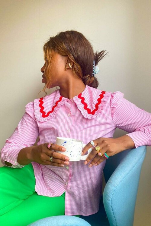 Мы не говорим о классическом воротнике или о воротничке «Питер Пэн». Блузки скандинавских девушек — это настоящий сельский шик с гиперболизированными широкими оборками на воротнике. А надевают они их под сарафаны или заправляют в мини-юбку.