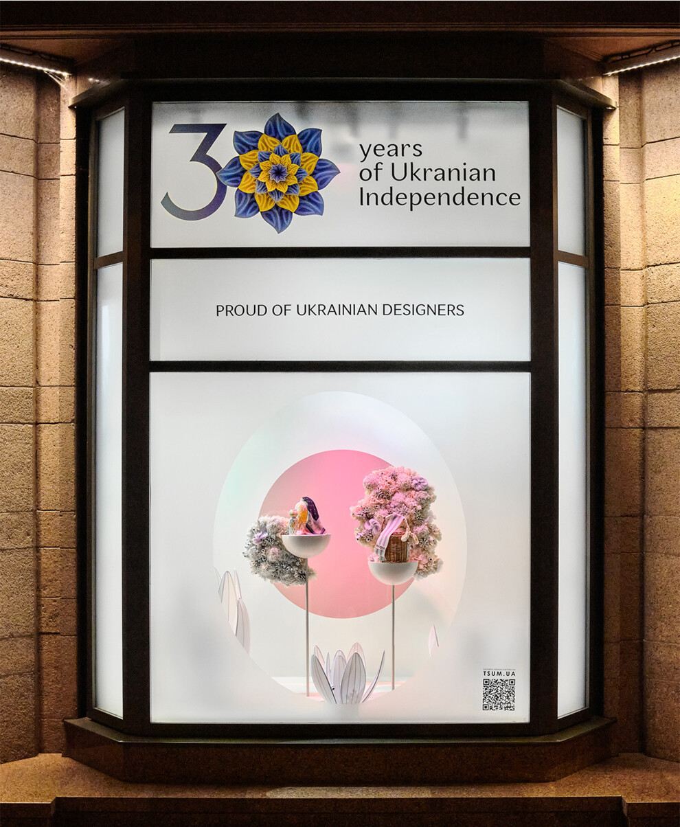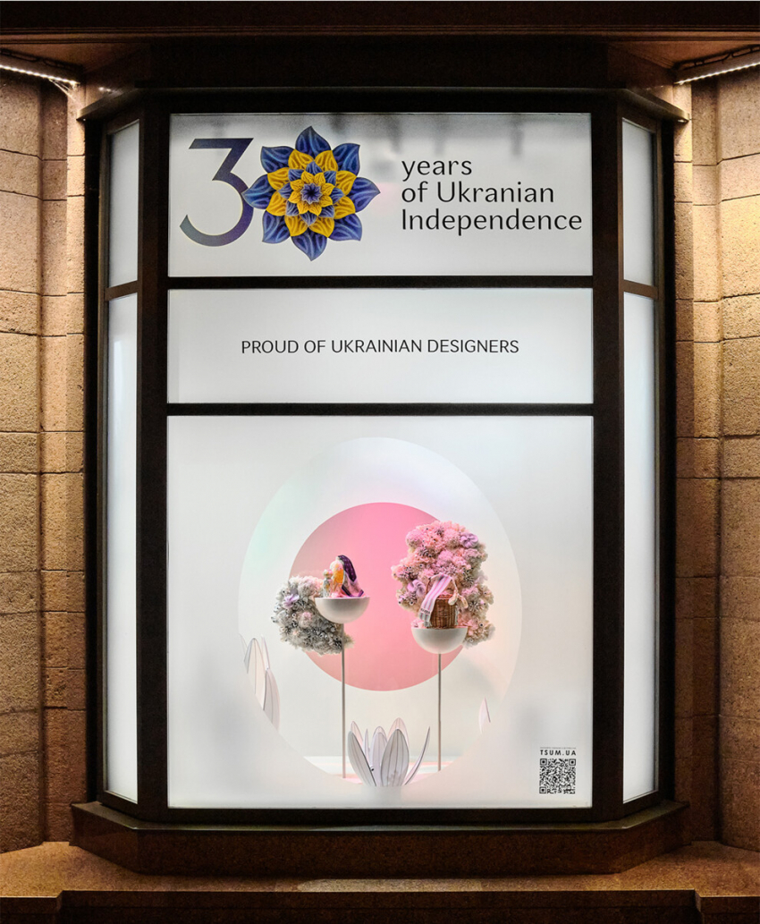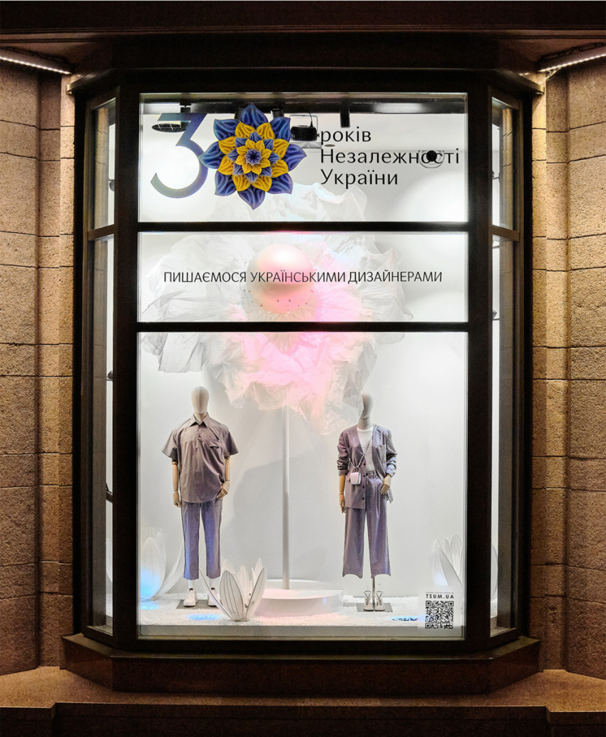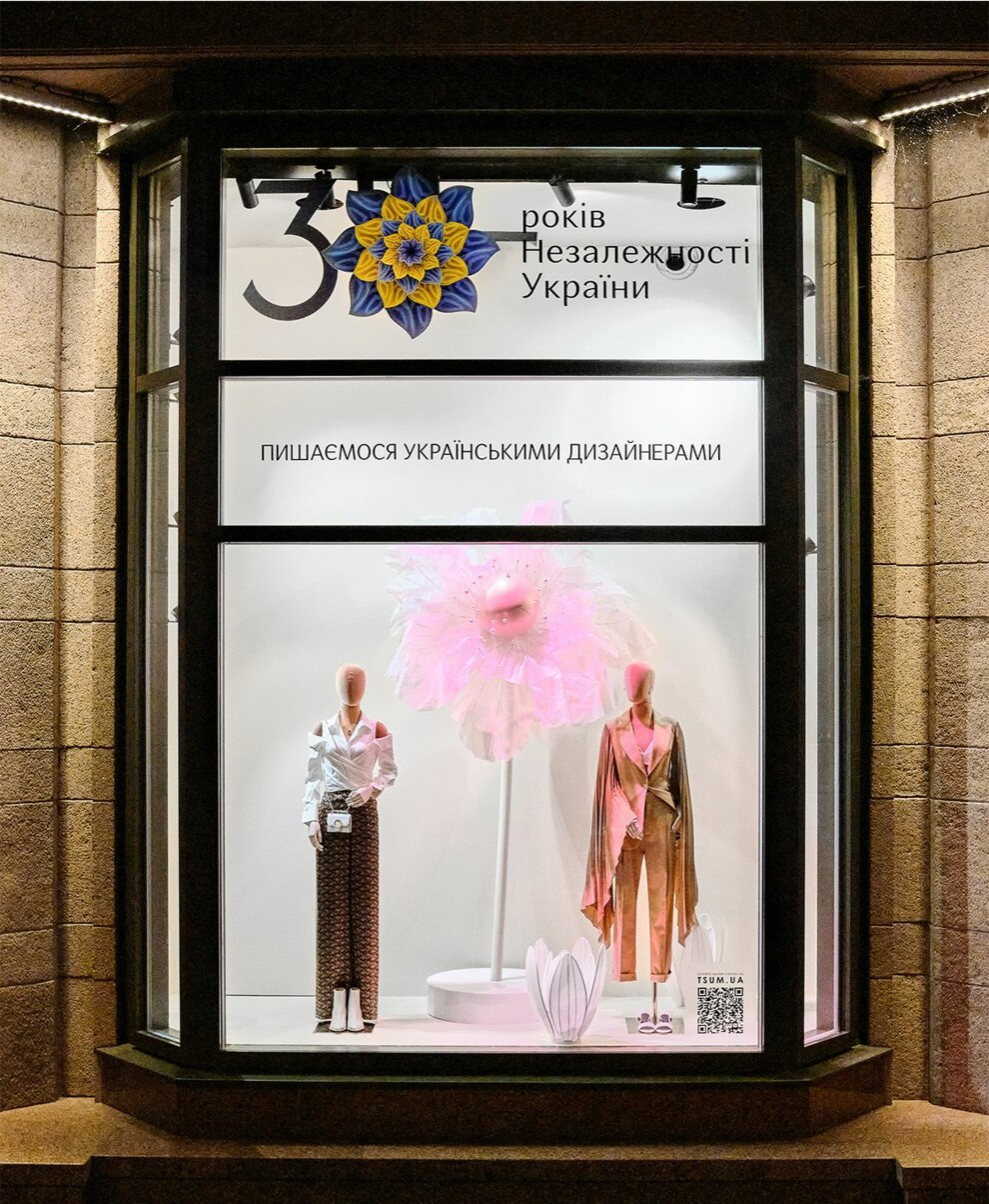 К 30-летию Независимости Украины в витринах ЦУМа представлены образы из коллекций украинских дизайнеров. Кроме этого, на 1-м этаже центрального универмага размещен специальный pop-up корнер с локальными брендами.