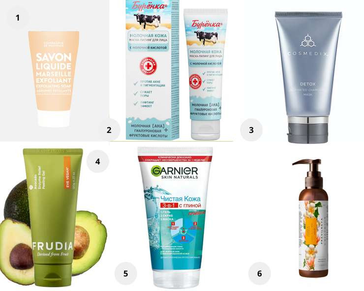 1. Жидкое мыло-скраб, Compagnie de Provence. 2. Буренка Маска-пилинг молочная для лица с молочной и гиалуроновой кислотами. 3. Детокс-маска с активированным углем DETOX, COSMEDIX. 4. FRUDIA скатка с авокадо. 5. Гель + Скраб + Маска 3-в−1 с глиной, GARNIER. 6. Очищающий Эксфолиант Тиаре & Ваниль, Pravilnaya Kosmetika.