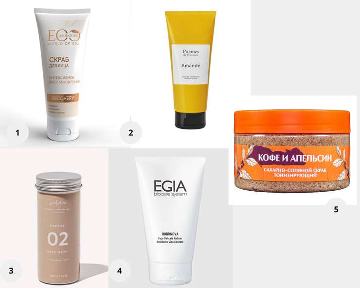 1. Скраб для лица SPA RECOVERY, EO Laboratorie. 2. Гель-скраб Amande — Миндаль, Poemes de Provence. 3. Энзимная маска для проблемной кожи с цинком и спирулиной, SmoRodina. 4. Мягкий очищающий скраб / Face Delicate Refiner, EGIA Biocare System. 5. Скраб для тела Кофе и апельсин, Сокровища Крыма.