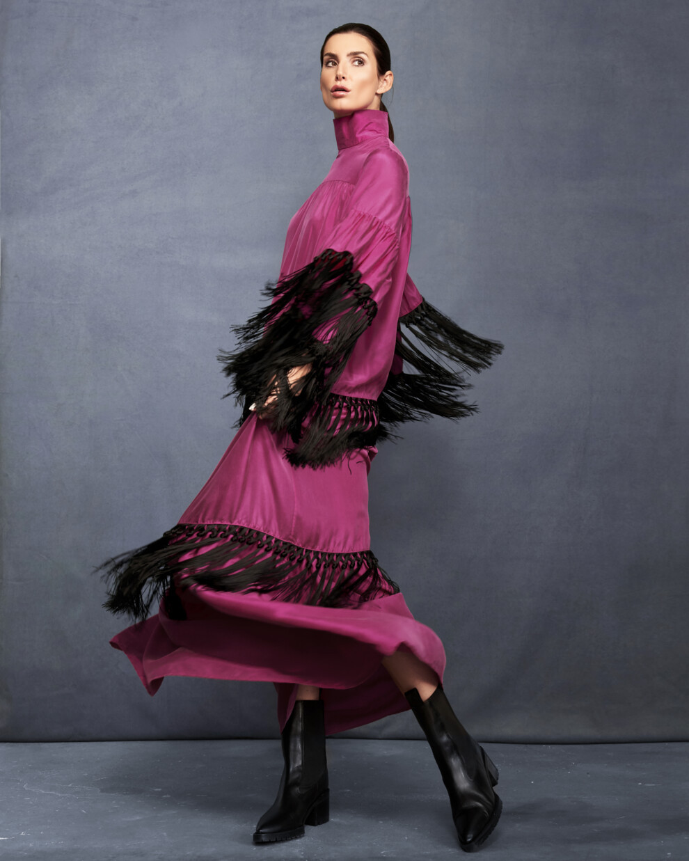 Фуксия – модный привет из 1980-х для самых смелыхПлатье Magda Butrym, серьги FendiМоя бьюти-рутина достаточно проста – я пью много воды, что помогает поддерживать здоровье кожи, занимаюсь с тренером 2-3 раза в неделю и стараюсь достаточно спать. А мой тайный ритуал – прогулки с любимыми собаками в горах недалеко от моего дома в Австрии. Они помогают не только тело держать в тонусе, но и отлично прочищают голову от лишних забот.