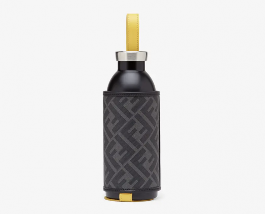 Черная глянцевая бутылка в роскошном чехле с монограммой Fendi — идеальный вариант для походов. Обратите внимание на петлю на крышичке желтого цвета — такой яркий акцент должен предотвратить потерю аксессуара в дюнах или лесах.
