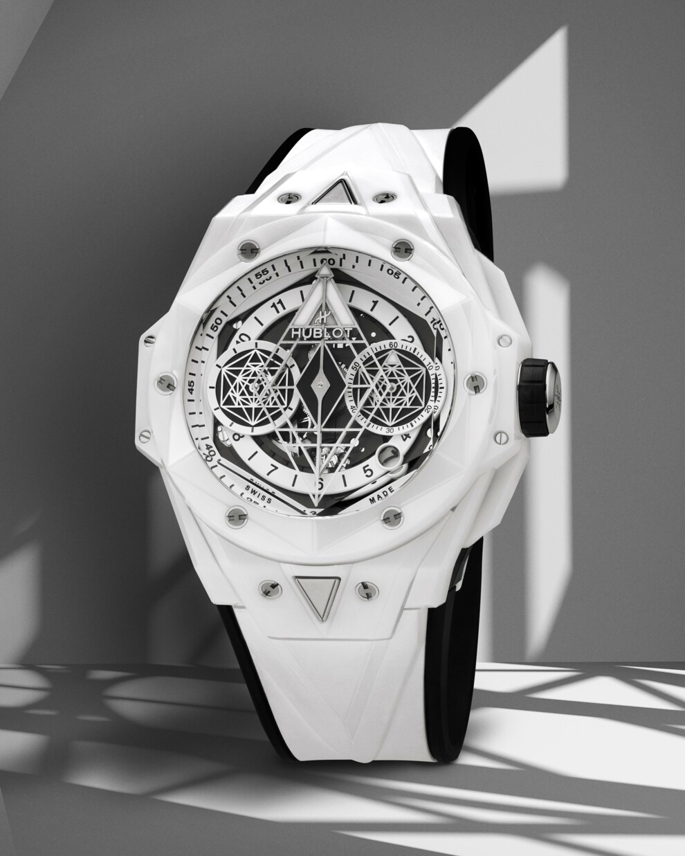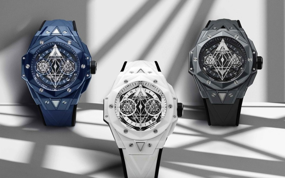 Версии Big Bang Sang Bleu II в сером, синем и белом цветах позволяют по-новому оценить архитектуру этой модели. Часы из керамики серого цвета отличаются современным дизайном, напоминающим городские пейзажи современных мегаполисов. Версия из керамики синего цвета служит отсылкой к названию модели, ведь Sang Bleu в переводе с французского означает "голубая кровь" — этот термин используется в исторической литературе для обозначения принадлежности к дворянству. Третья версия имеет простой, но в то же время многогранный дизайн. Эти часы диаметрально противоположны версии All Black, которая была выпущена в прошлом году. Их оригинальный оттенок — это ослепительная игра света. Граненая архитектура безеля, корпуса и ремешка демонстрирует тонкие линии и изгибы часов.