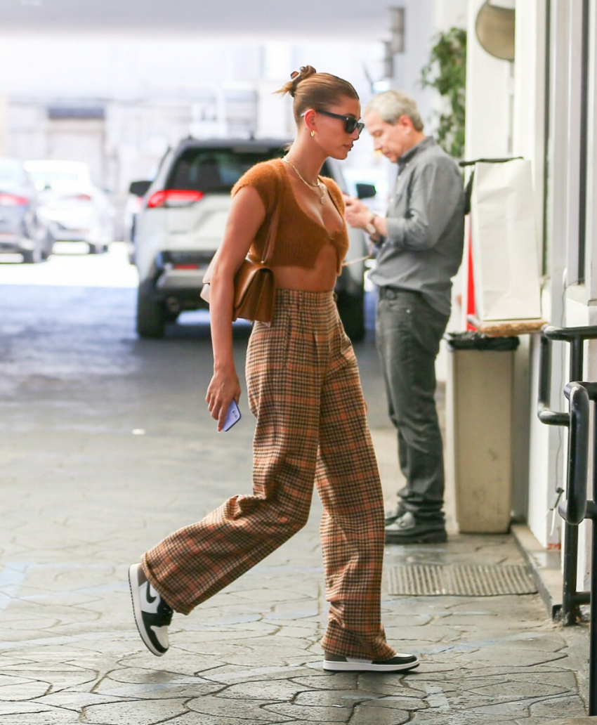 После летних поездок по Парижу и Греции, Хейли Бибер вернулась в свой родной город - Лос-Анджелес. Для повседневного выхода модница надела трикотажный топ из новой коллекции Jacquemus осень-зима 2021/2022, которая была представлена всего неделю назад брендом. Хейли стала одной из первых девушек, продемонстрировавших новый кашемировый топ в жизни. Она соединила свою новую вещь с широкими клетчатыми брюками, кедами Nike Air Jordan 1 и карамельной сумкой через плечо Rylan 4.2. Завершающей деталью стали ее фирменные многослойные цепочки.