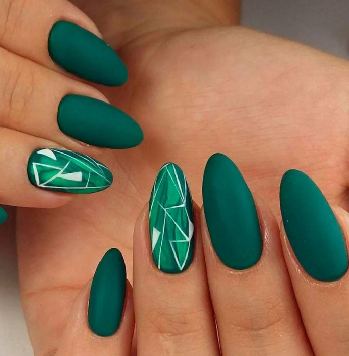 В одном маникюре можно сочетать разные оттенки зеленого с другими цветами. Можно нарисовать на ногтевой пластине оригинальный сюжет, используя темно-зеленый, светло-желтый, ананасовый и белый цвета.