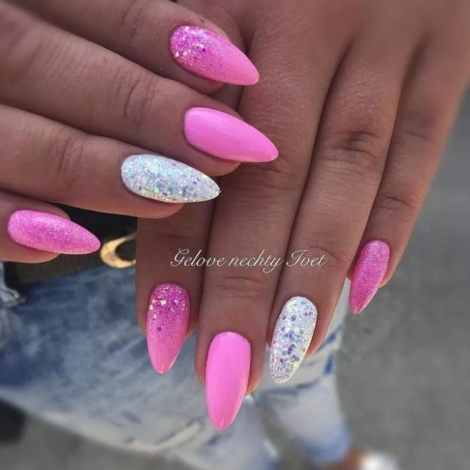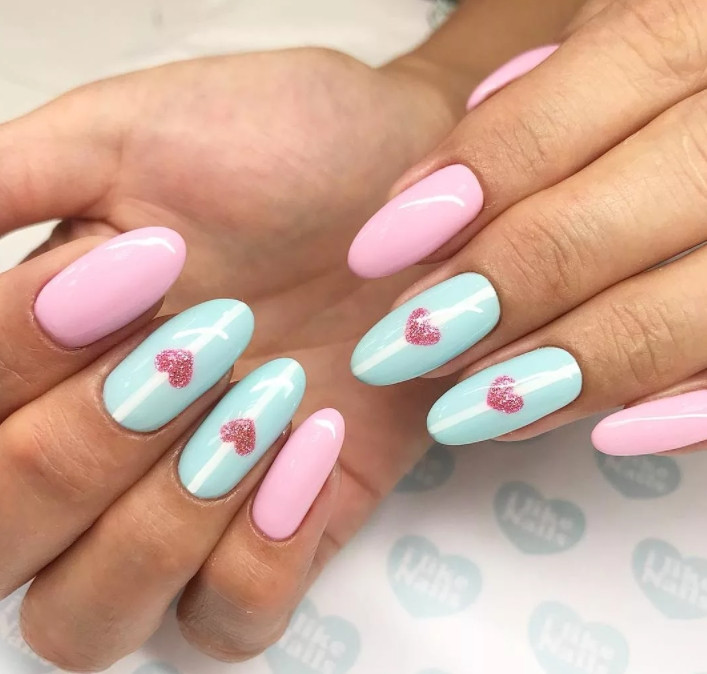 В этом году глиттер должен стать лишь тонким дополнением к однотонным ногтям. Это означает, что можно покрасить один ноготь любым гелем или одним из гибридных лаков. Это может быть полупрозрачный розовый лак со светящимися частицами. На оставшиеся ногти нанесите гибридный лак без блесток и больше ничем не украшайте их. В современных дизайнах важна умеренность.