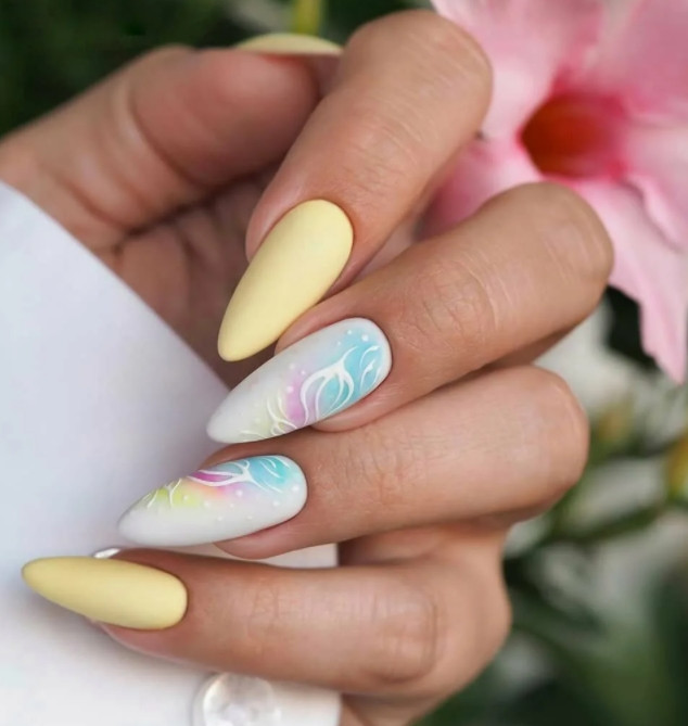 Вдохновленный психоделической яркой модой хиппи, мотив тай-дай – идеальная идея для весенне-летнего маникюра. В этом сезоне актуален маникюр тай-дай в пастельных, сладких оттенках. Такой разноцветный модный узор лучше всего смотрится на длинной ногтевой пластине. И это доказывает, что в нынешнем сезоне необязательно ограничивать себя в цветах.