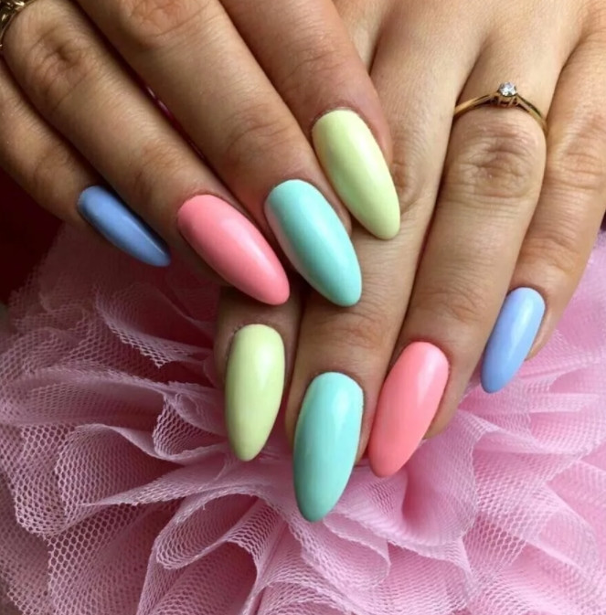 Чтобы сделать весенний пастельный маникюр, используйте красочные гибридные лаки: пастельные голубые, розовые, светло-желтые оттенки, нежный оранжевый и тонкий фиолетовый.