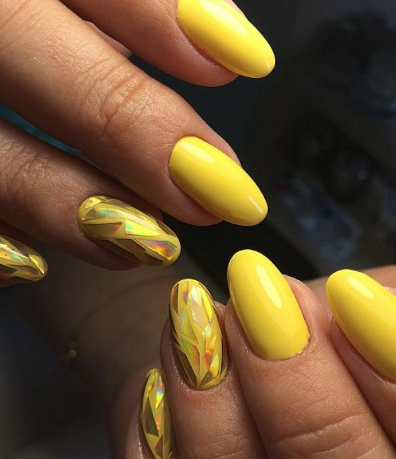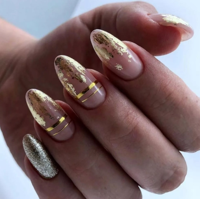 Такой яркий дизайн ногтей можно создать с помощью золотого блестящего лака, страз или золотых наклеек. Усилить эффект можно золотым лаком, например, матовым. У этих элементов декора из золота есть плюс – они отлично смотрятся на неокрашенных ногтях. Достаточно наклеить на ноготь золотую точку, бантик или узор, и маникюр готов. Для вдохновения изучите предложенные в этом дизайне фото идей на 2022 год.