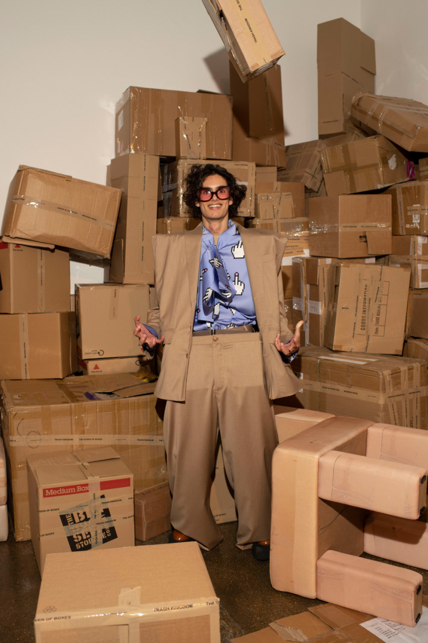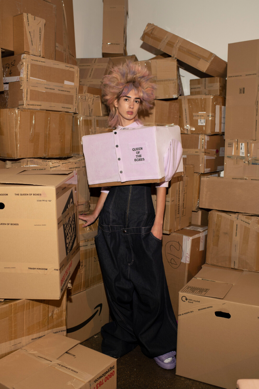 «Коробки стали обычным мусором в нашей повседневной жизни. Будь то ежедневные поставки из интернет-магазинов, китчевые распаковочные видео, наводняющие социальные сети, или просто радость от открытия чего-то в упаковке — новая коллекция основана на последних 18 месяцах жизни, — говорит Зинько. — Окунувшись в безумие домашнего обихода и ища новые способы задействовать наивное творчество, я начала разрабатывать коллекцию, играя с размещением картонных коробок на собственном теле, в конечном итоге переработав их в настоящую одежду».