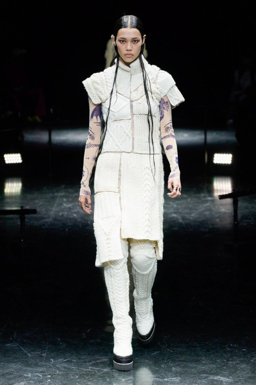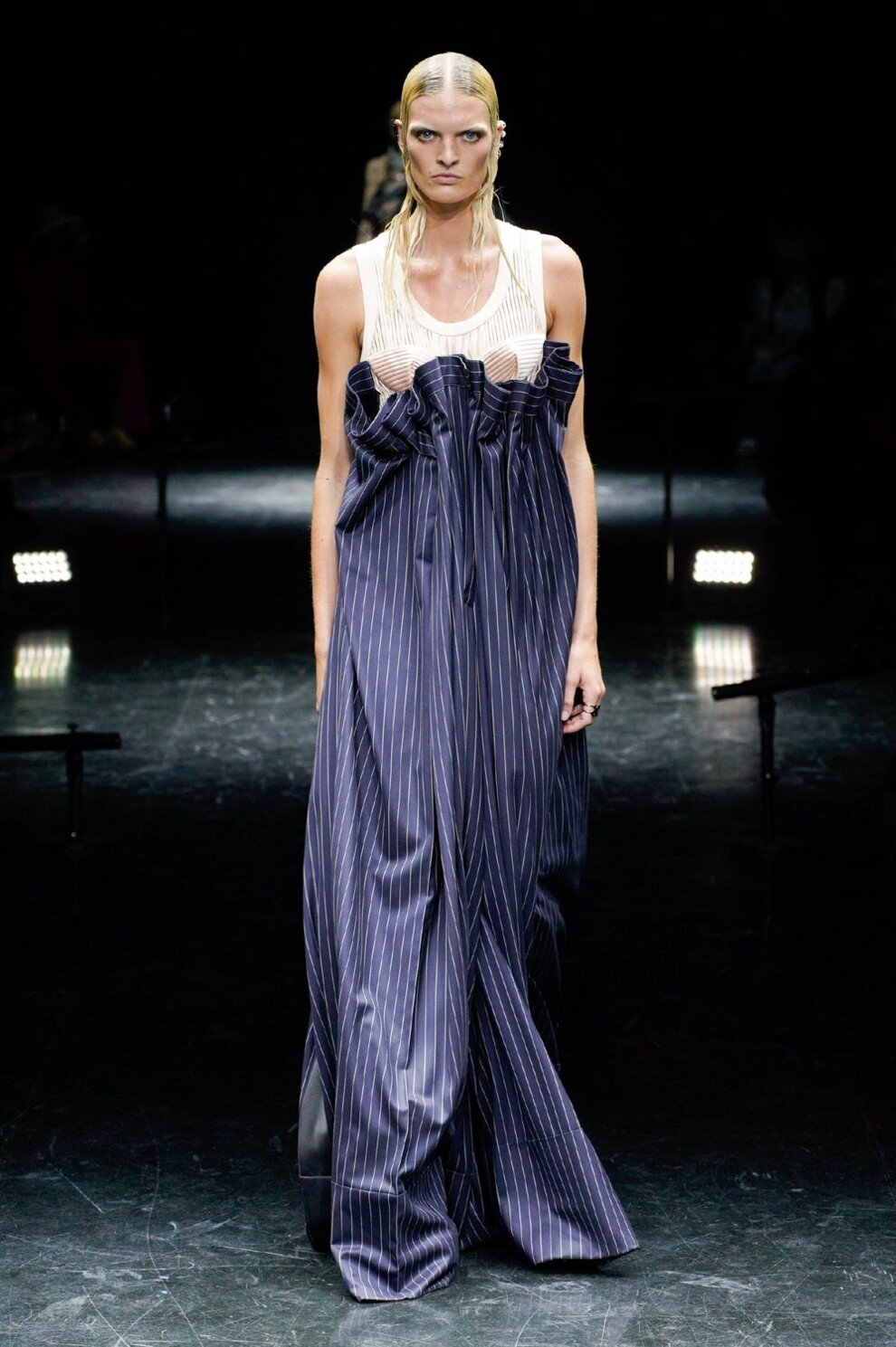 Jean Paul Gaultier Couture осень-зима 2021/2022 Jean Paul Gaultier Couture осень-зима 2021/2022Настоящая поклонница Дома, Титосэ не прибегала к помощи архивов: “Я не хотела рассматривать их буквально, чтобы иметь свободу передать настроение Sacai и актуальное течение времени”. Например, для первого образа коллекции, из реконструированного мужского костюма в тонкую полоску переосмыслили культовый конический топ Jean Paul Gaultier 1984 года. В итоге получились корсет, верхняя юбка и сетчатые элементы – вечная классика с настроением панка.