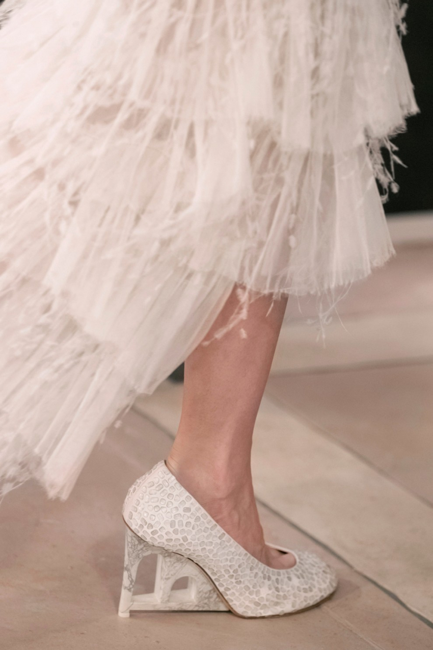 Fendi CoutureFendi CoutureДжонс сканировал платья середины 1800-х и 1920-х годов, для создания жаккардов, которые сначала разрезались на части, а затем расшивали хрустальными бусинами. Желуди, цветы и другие ботанические мотивы были выгравированы техникой интарсия на узких дневных платьях, вечерних образах без бретелек и пышных бальных нарядах. Мастерство Кима Джонса в декоративных аспектах высокой моды позволили ему добиться таких привлекательных эффектов, как вышивка лепестками по всему периметру объемного платья Кейт Мосс или мраморное покрытие облегающего платья Эмбер Валлетты.