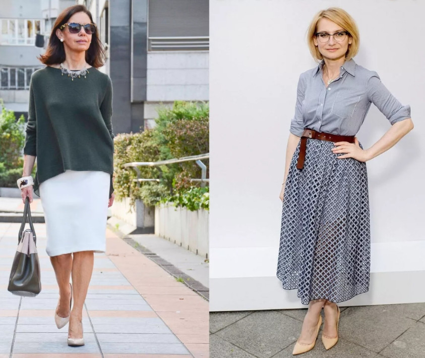 - Юбки. Оптимальная длина для женщины 50 лет — миди. В зависимости от роста, степени стройности выбирают фасон. Фигуру подчеркнет юбка-карандаш, А-образный силуэт. Легко, по-весеннему выглядят легкие юбки плиссе, с оборками, воланами.