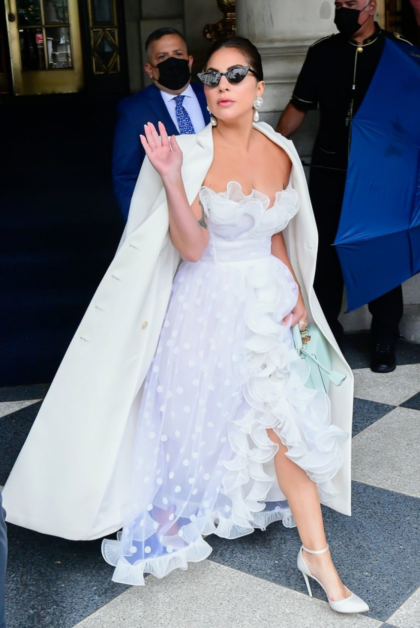Леди Гага в платье Giuseppe di MorabitoЧетвертым нарядом Гаги стало белоснежное платье из коллекции Giambattista Valli весна-лето 2021 из нежного тюля с юбкой с фестонами. Певица дополнила его с помощью пальто свободного кроя Fendi, белых туфель и мятной геометрической сумочки. Несмотря на то, что Гага не собирается замуж, это платье навеяло мысли о свадебной церемонии. Напомним, что певица и актриса уже больше года находится в отношениях с Майклом Полански.