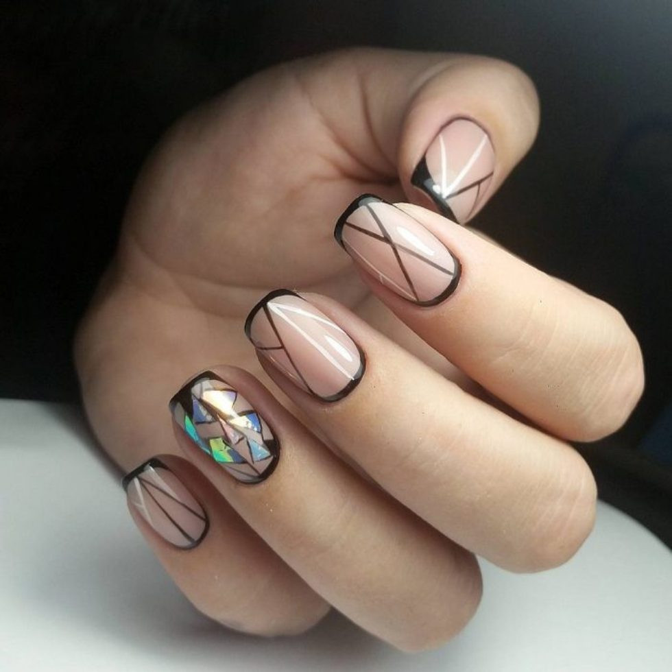 Желтые оттенки в сочетании с нюдовой основой и геометрическими рисунками будут оригинально смотреться в любой ситуации. Такое сочетание хорошо подходит для любого случая, важно выбрать правильные элементы геометрии. Черный цвет в сочетании с пастельными тонами подходит к любому образу.