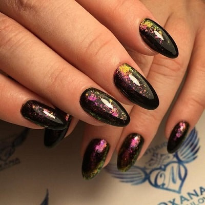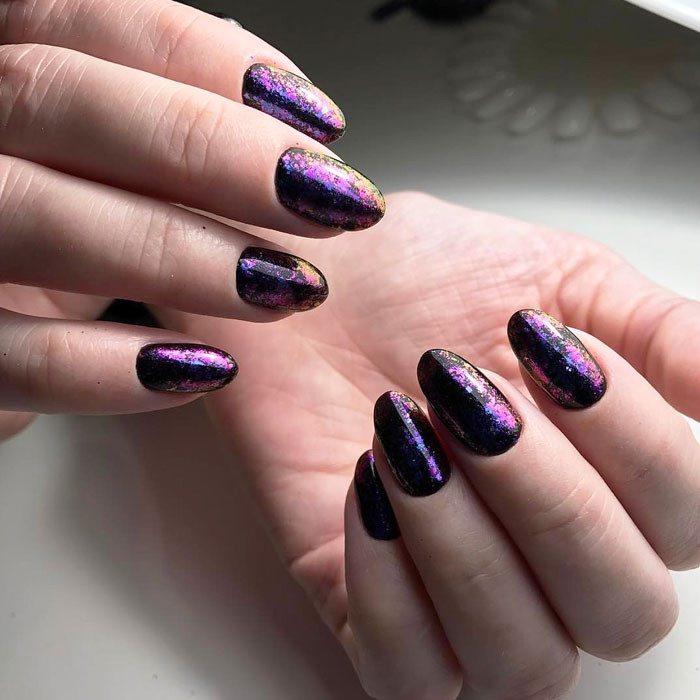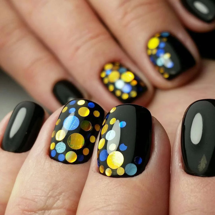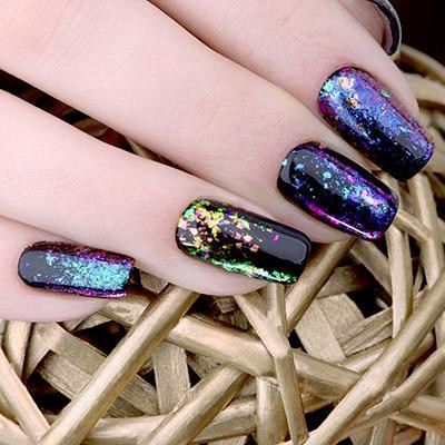 Особенностью маникюра с блестками считается его универсальность. Он подходит для ногтей разной длины, хорошо сочетается с основой разного оттенка.