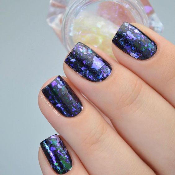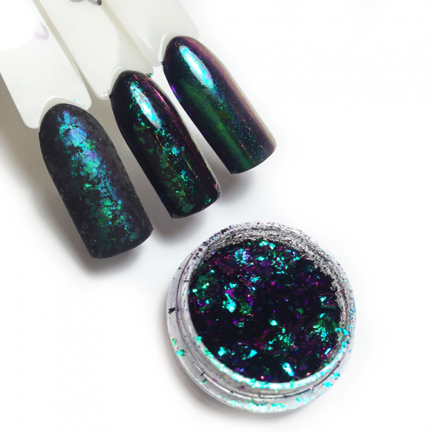 Стильно будет выглядеть покрытие самих хлопьев матовым тоном. В таком случае поверхность ногтевой пластины будет смотреться бархатистой. Если матовым тоном покрываются изумрудные и золотистые хлопья, получится необычная имитация драгоценных пород камней.