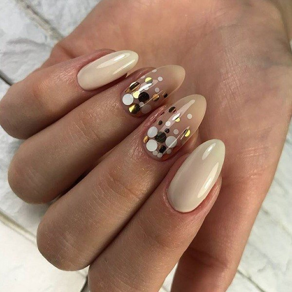 Модные тенденции последних лет особенно подчеркивают естественность, натуральность. В связи с этим нужно сочетать хлопья Юки с нюдовыми оттенками. Это придаст утонченность маникюру, сделает акцент на тонкие аккуратные пальчики.