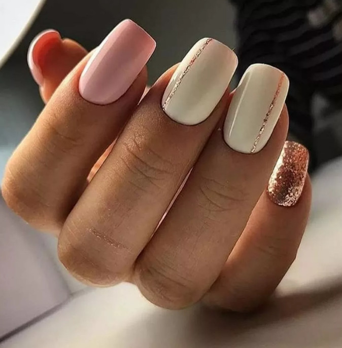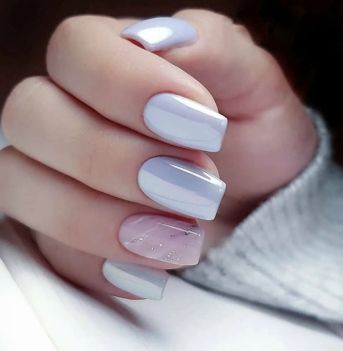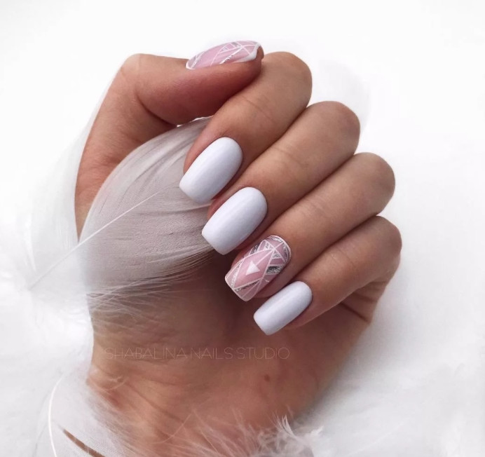 - «Негативное пространство» в светлых тонах. Часть ногтя окрашивается непрозрачным светлым цветом, а другая область – прозрачным бесцветным лаком, в результате создаются интересные узоры.