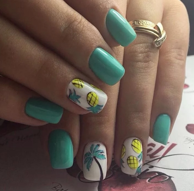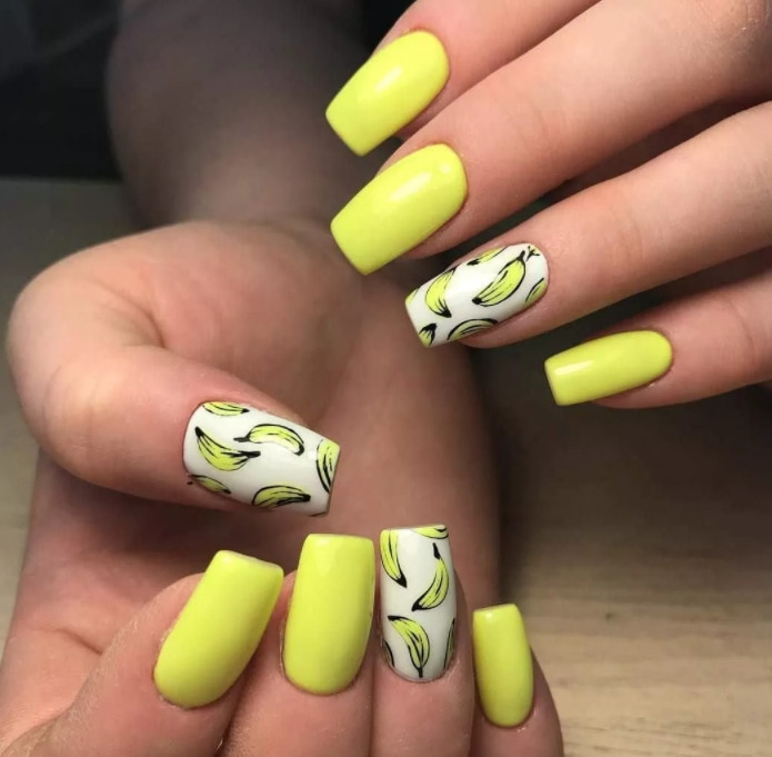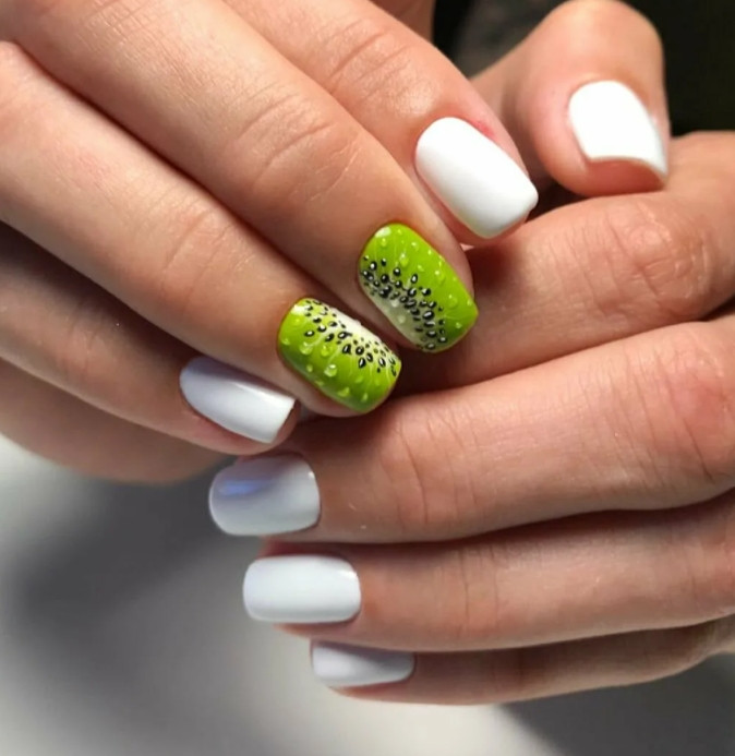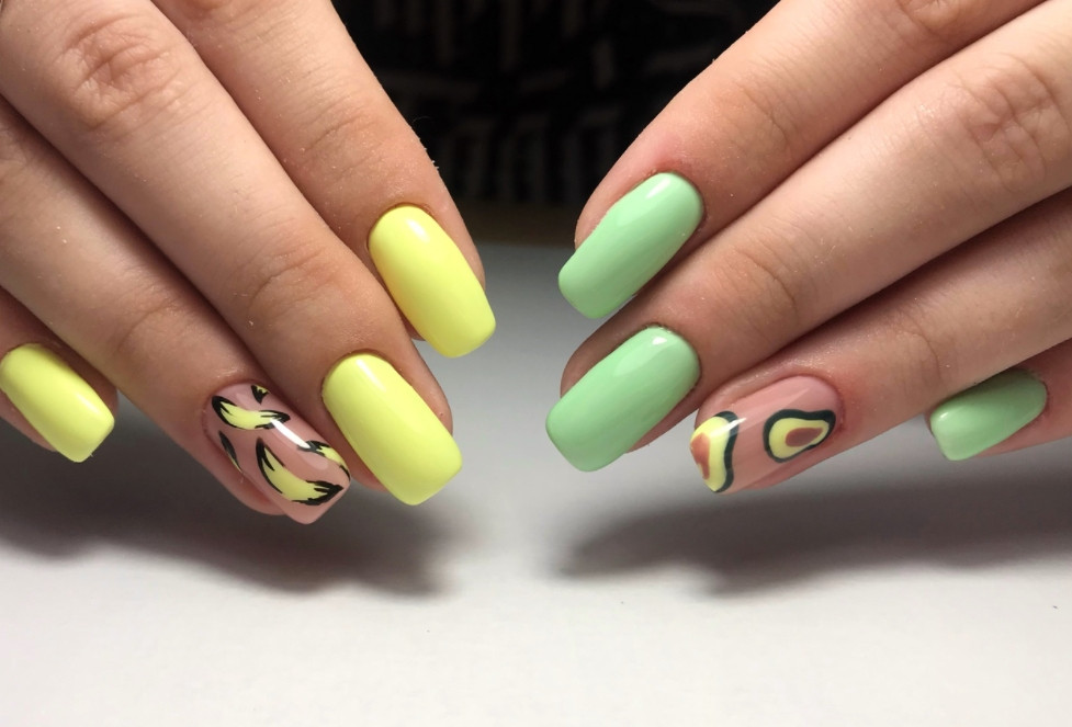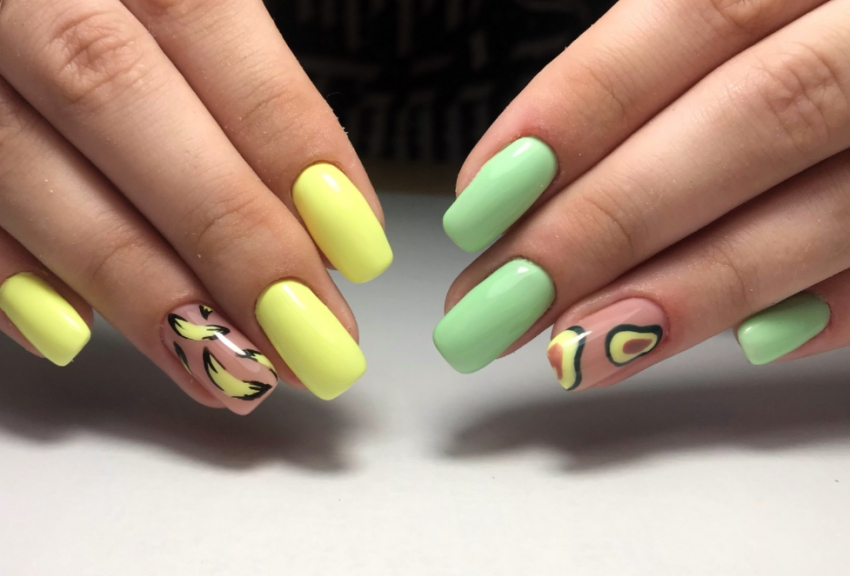 Достаточно нескольких красочных лаков, чтобы изобразить на ногтях красивые фрукты. Можно украсить таким образом один ноготь, а на остальные нанести какой-нибудь яркий сочный цвет, желательно неоновый. Фруктовые узоры могут быть очень насыщенными или нежными и пастельными. Все зависит от ваших предпочтений.