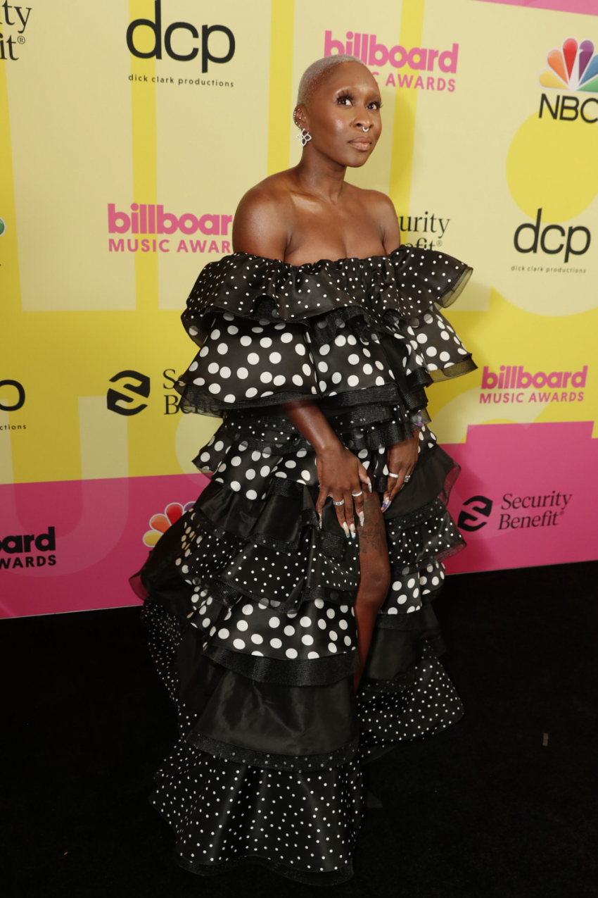 Алишия КисСинтия ЭривоСпециально для Синтии Эриво американский бренд Carolina Herrera создал платье с гороховым принтом и каскадом воланов, в которых хочется утонуть. Благодаря открытым плечам и высокому разрезу образ при этом получился по-настоящему летним и при этом соблазнительным.