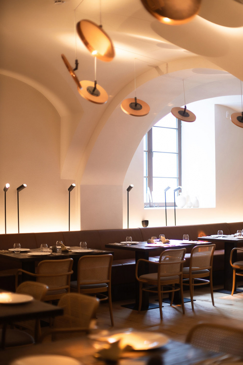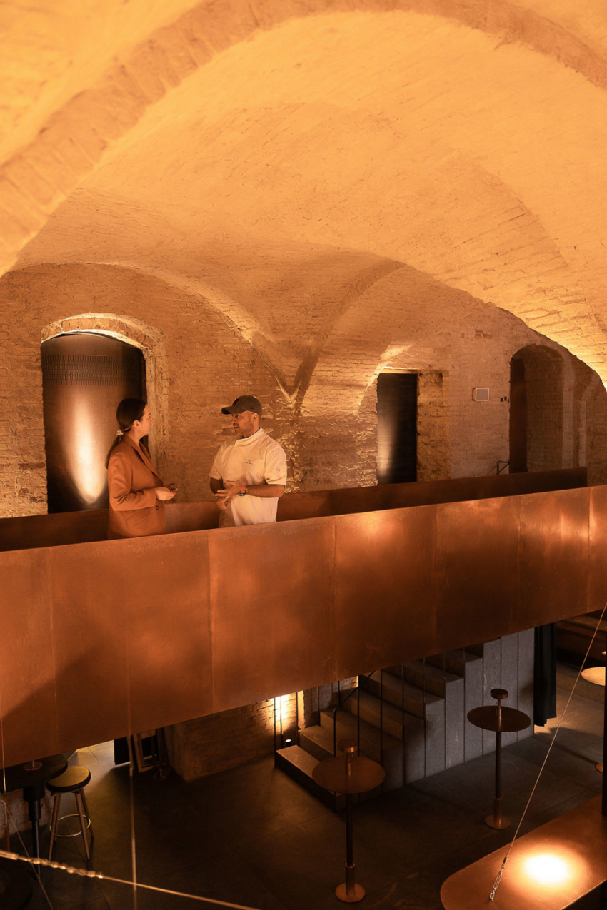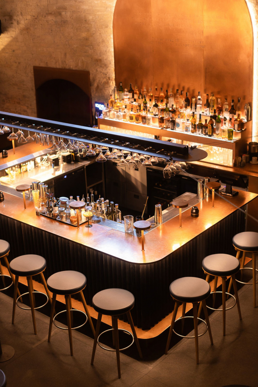 Бар ресторана SamnaТак, в Samna самая большая кухня из всех моих проектов как по размеру, так и по техническому оснащению. Одновременно здесь легко размещаются 25 поваров, у которых в распоряжении есть все – от сувида и хоспера до гриля и аппарата для приготовления мороженого. Мне нравится, что команда, которая занималась дизайном, подчеркнула возраст этого здания, сохранив оригинальную кирпичную кладку и эти роскошные своды.