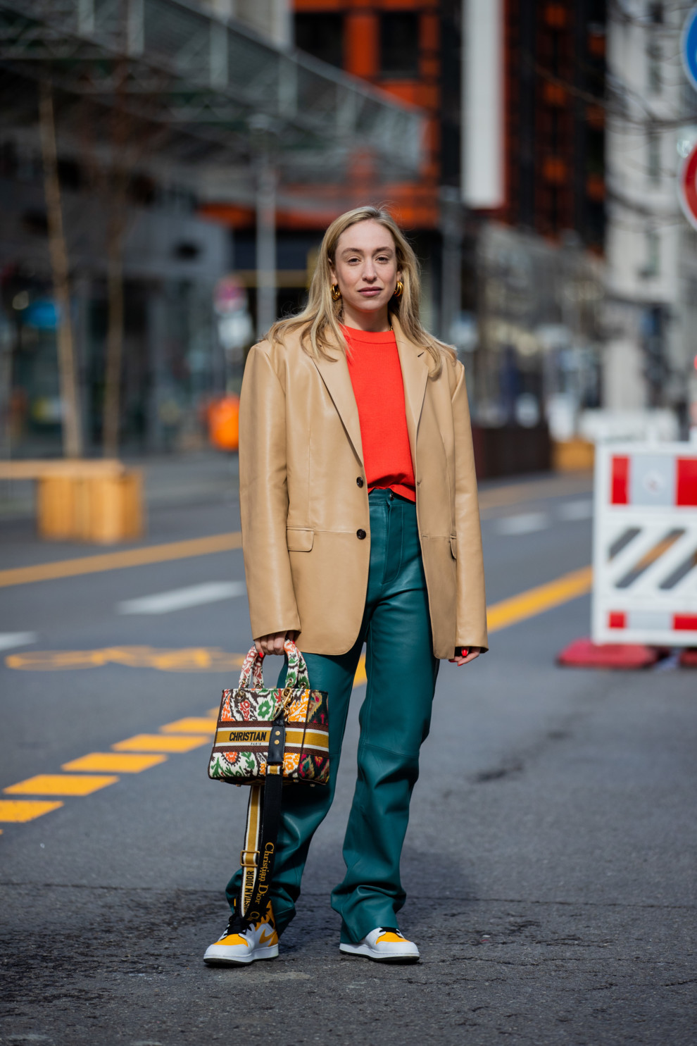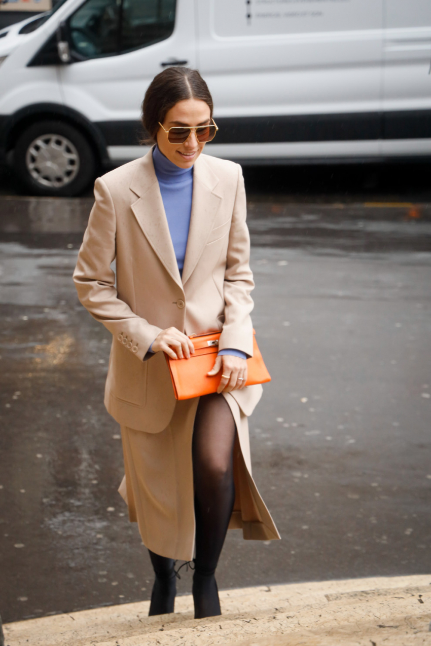 Стилизация в духе колорблокинга невероятно актуальна в этом сезоне. Бежевый жакет в таком образе выступает в роли нейтрального холста для смелых экспериментов. Дерзкие изумрудный и сицилийский апельсин, нежные фиалковый и персиковый, насыщенные фиолетовый и тыквенный - вдохновение на новые модные открытия можно найти в ярких образах звезд стритстайла.