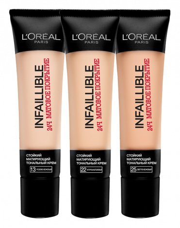 - L'OREAL, французский бренд, тональный крем Infaillible. Форма выпуска – пластиковая туба с острым наконечником, который выступает в роли дозатора. Оттенков не много, текстура достаточно плотная, быстро сохнет, не течет на солнце. Матирующая основа прекрасно скрывает блеск от себума.