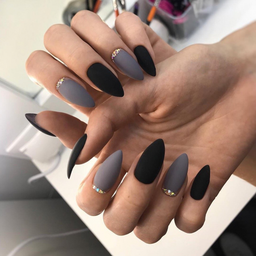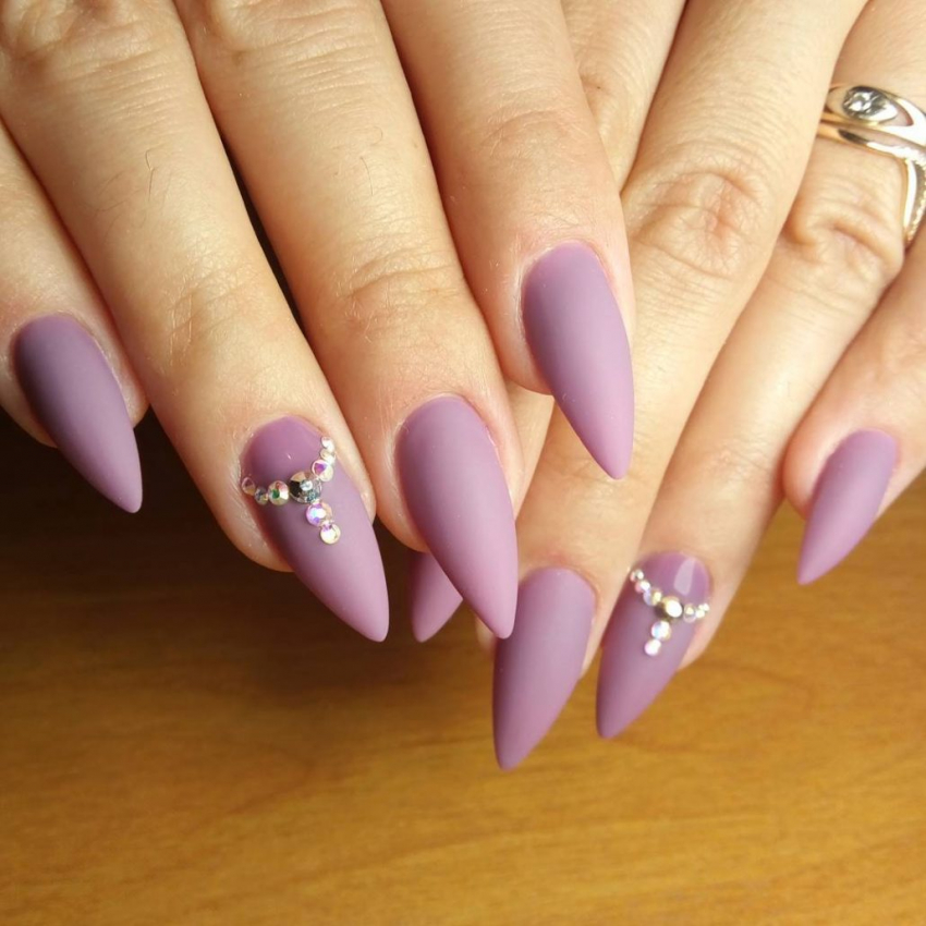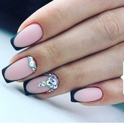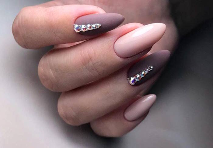 На длинных ногтях стразы идеально сочетаются со светлым лаком. Если предпочтение отдается темным оттенкам, следует использовать матовый топ.