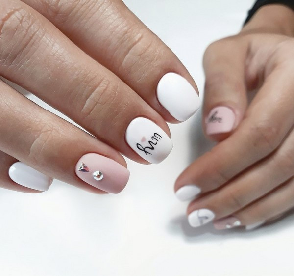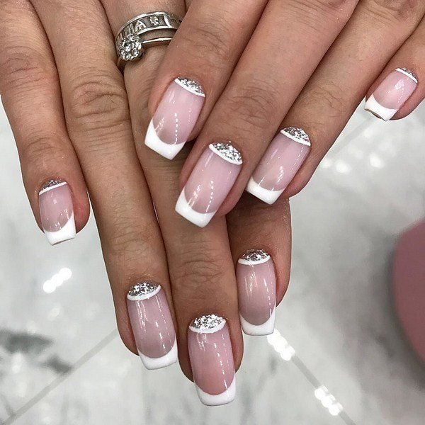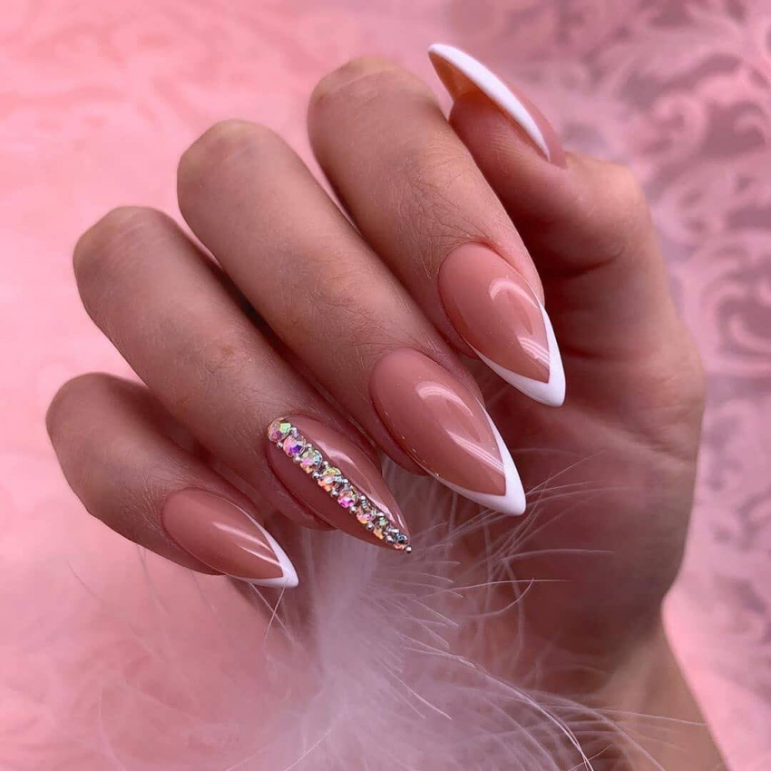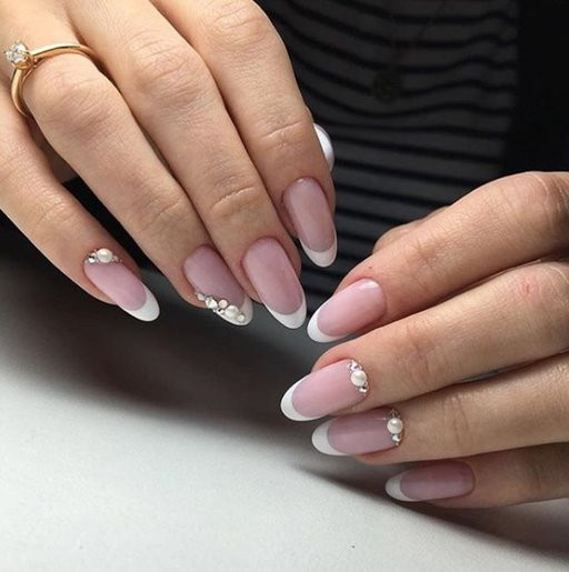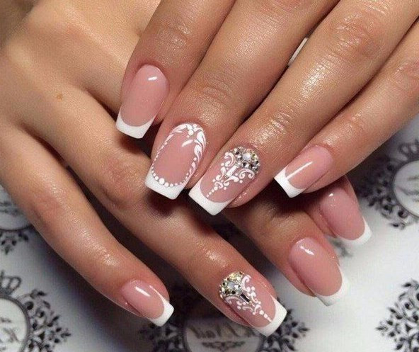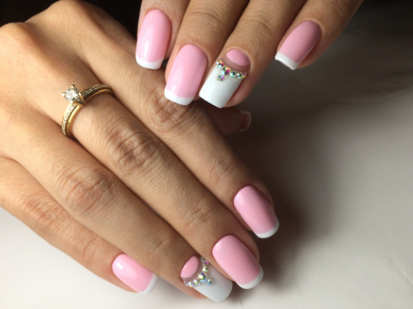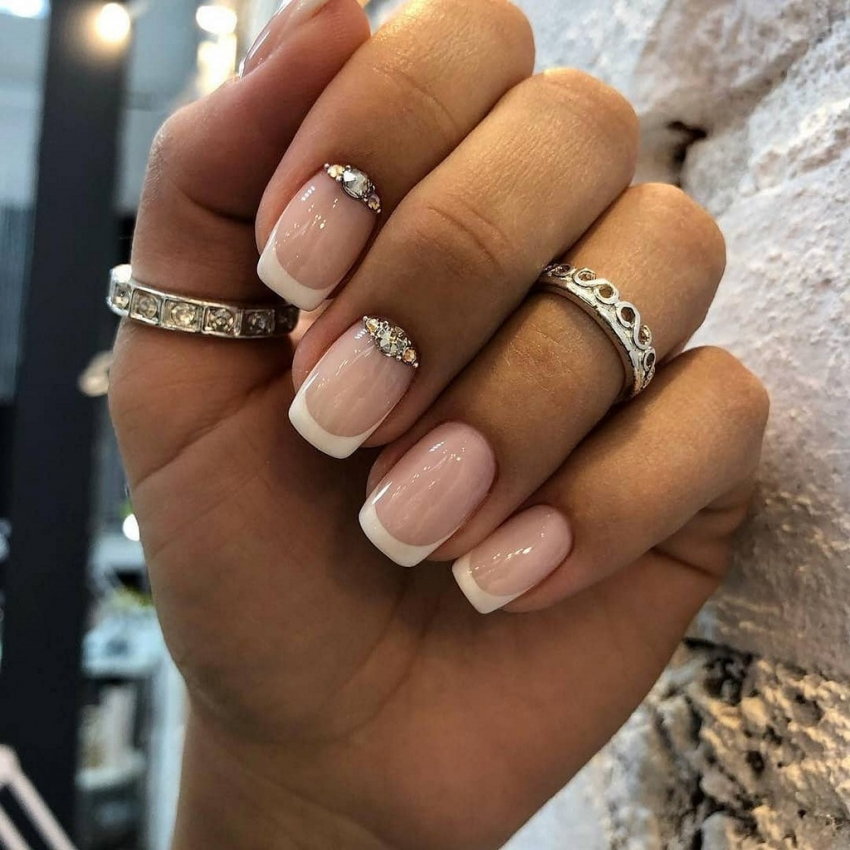 Этот вариант маникюра обычно выбирают невесты. Но он подойдет и для повседневной носки. Классический вариант исполнения дизайна — светло-розовая подложка, белая линия и светлые стразы. В 2022 году ни цвета, ни украшения уже не будут актуальны.