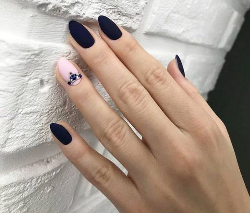К модным тенденциям маникюра со стразами в 2022 году, судя по фото стилистов, будет относиться и сочетание камней с темным лаком. Такой дизайн предпочтительней использовать девушкам с короткими ногтями.