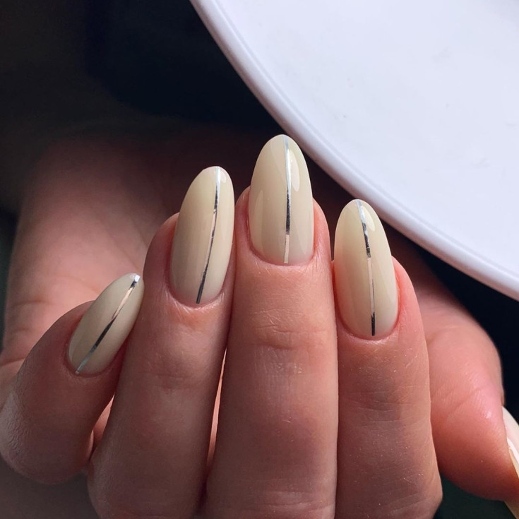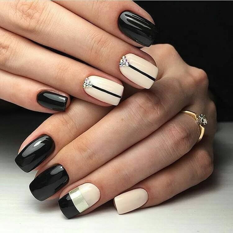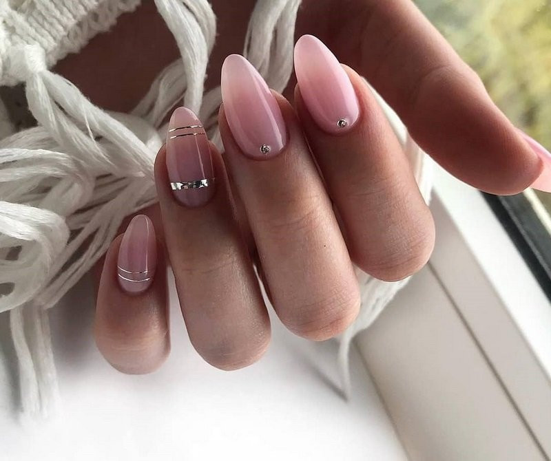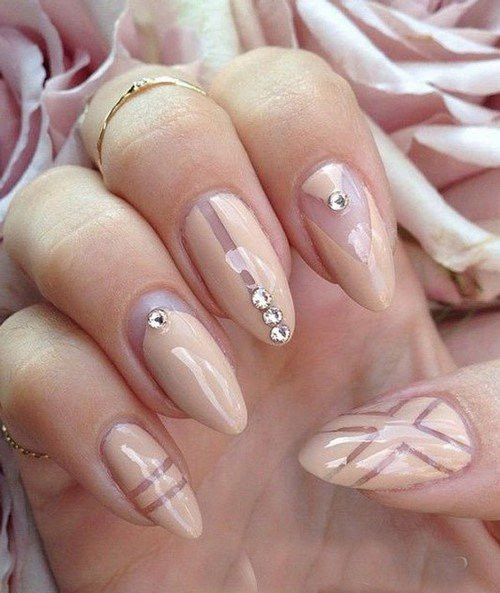 На нюдовую подложку можно нанести линии или геометрический рисунок, добавив по углам стразы. Необычно смотрятся камни, наклеенные в хаотичном или шахматном порядке. Такой дизайн можно сделать на всех ногтях или только на 2-4 пальцах.