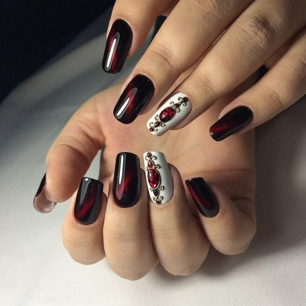 Такой дизайн следует продумать до мелочей. Не стоит задействовать более 1-2 пальцев под яркий рисунок. Иначе можно получить не стильный маникюр, а лепнину, которая никогда не будет аккуратной. Стразы обязательно должны стать частью ногтевого арта: