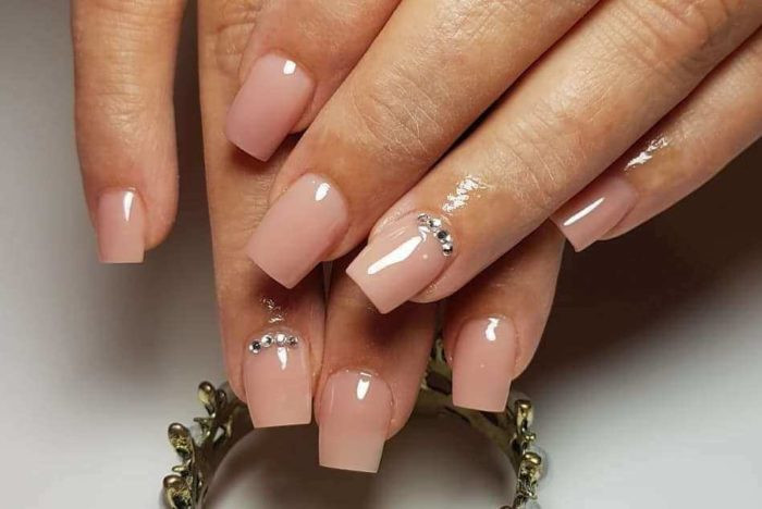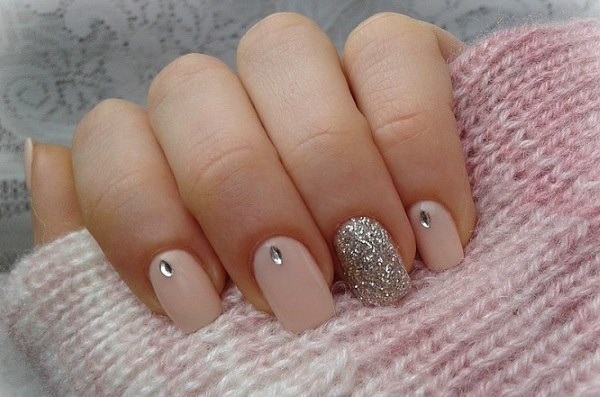 Даже с использованием страз можно создать минималистичный дизайн на ногтях. Лак подбирается однотонный для всех ногтей в базовом цвете: