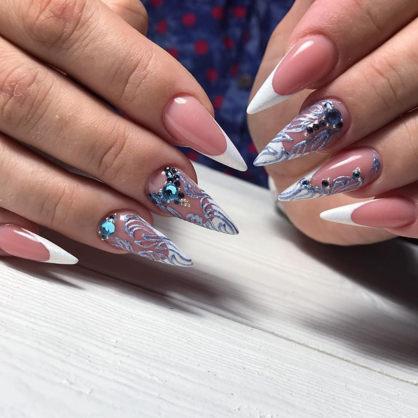 Стразы на острых длинных ногтях