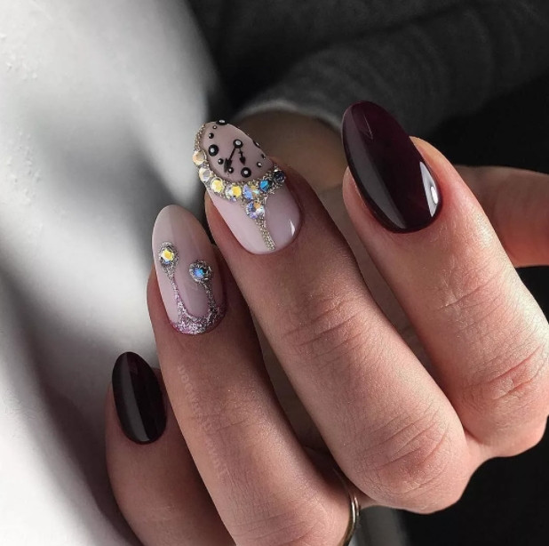 Но если женщина не готова к подобным экспериментам, она может сделать маникюр в минималистичном стиле. Отличным вариантом станет нанесение нюдового оттенка, дополненного черной полоской на концах ногтей. При этом один ноготь полностью покрывают темным лаком, после чего выкладывают россыпь мелких кристаллов или потали.