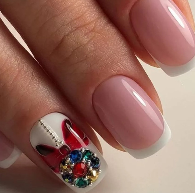 В 2022 году будет актуальна глянцевая полоска. Она наносится при помощи пудры. Воздушная масса втирается на кончики ногтей, создавая зеркальное покрытие. Для создания сложного дизайна мастера используют звездочки, снежинки и стразы.